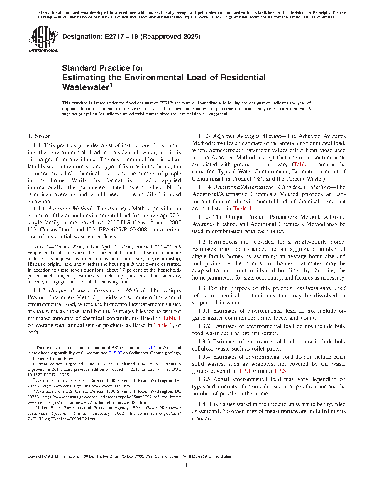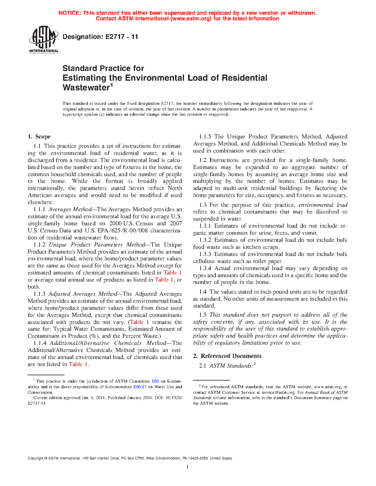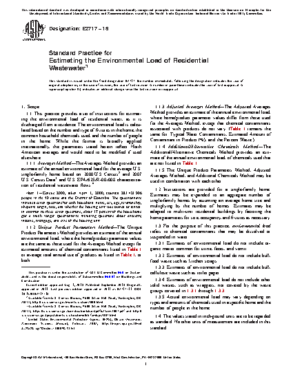 1.1 This practice provides a set of instructions for estimating the environmental load of residential water, as it is discharged from a residence. The environmental load is calculated based on the number and type of fixtures in the home, the common household chemicals used, and the number of people in the home. While the format is broadly applied internationally, the parameters stated herein reflect North American averages and would need to be modified if used elsewhere.