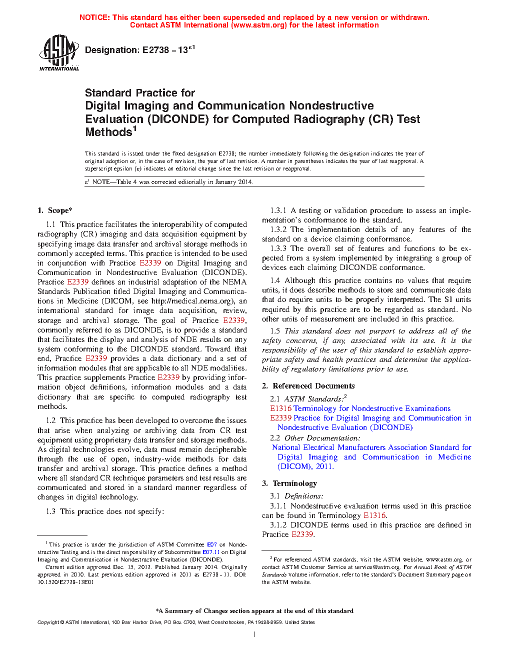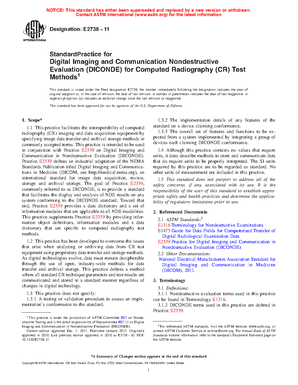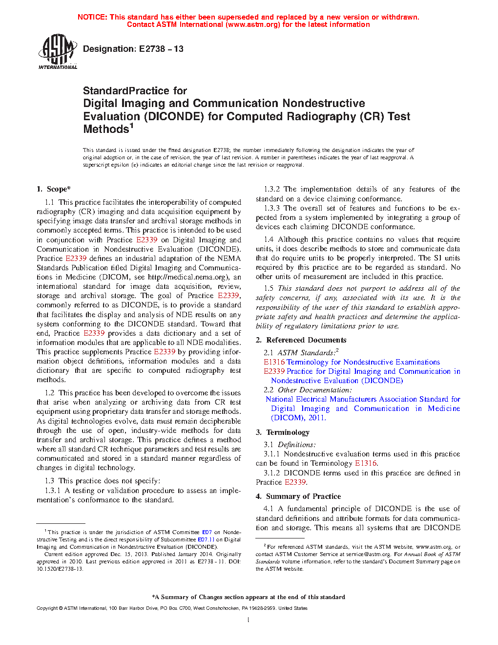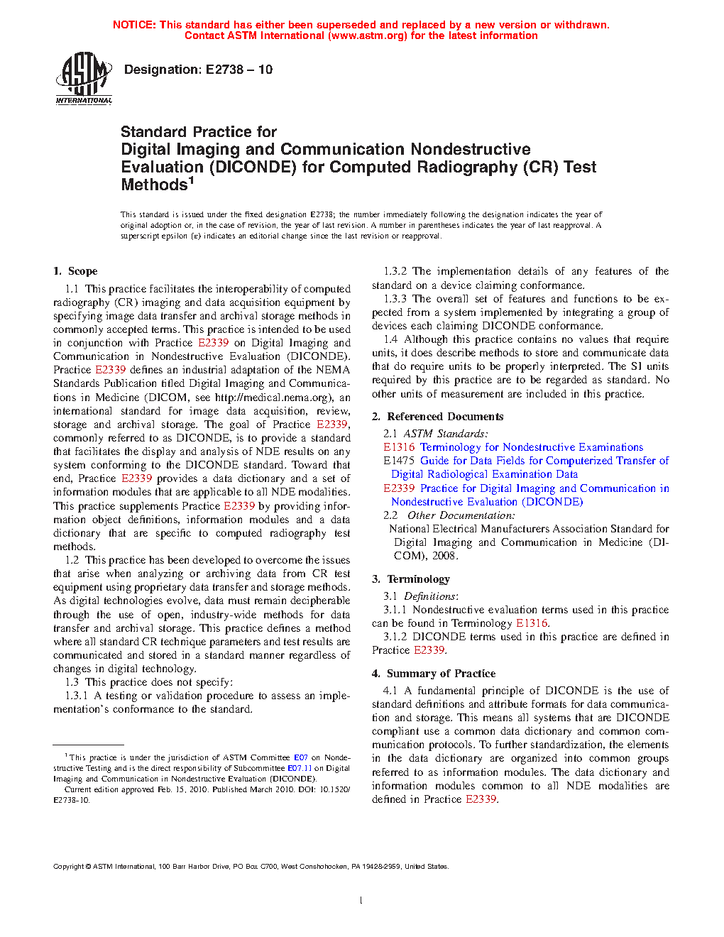 1.1 This practice facilitates the interoperability of computed radiography (CR) imaging and data acquisition equipment by specifying image data transfer and archival storage methods in commonly accepted terms. This practice is intended to be used in conjunction with Practice E2339 on Digital Imaging and Communication in Nondestructive Evaluation (DICONDE). Practice E2339 defines an industrial adaptation of the NEMA Standards Publication titled Digital Imaging and Communications in Medicine (DICOM, see http://medical.nema.org), an international standard for image data acquisition, review, storage and archival storage. The goal of Practice E2339, commonly referred to as DICONDE, is to provide a standard that facilitates the display and analysis of NDE results on any system conforming to the DICONDE standard. Toward that end, Practice E2339 provides a data dictionary and a set of information modules that are applicable to all NDE modalities. This practice supplements Practice E2339 by providing information object definitions, information modules and a data dictionary that are specific to computed radiography test methods.