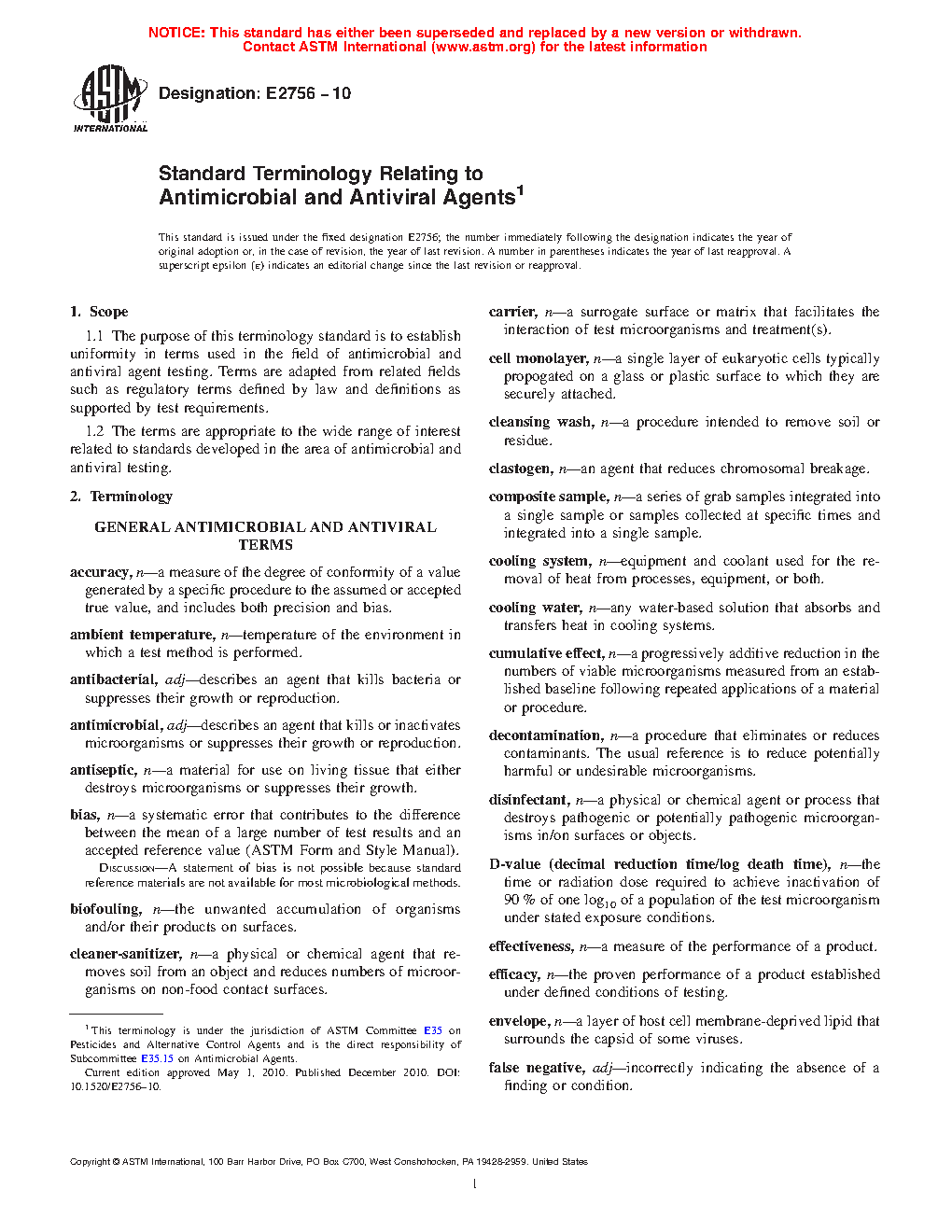 1.1 The purpose of this terminology standard is to establish uniformity in terms used in the field of antimicrobial and antiviral agent testing. Terms are adapted from related fields such as regulatory terms defined by law and definitions as supported by test requirements.