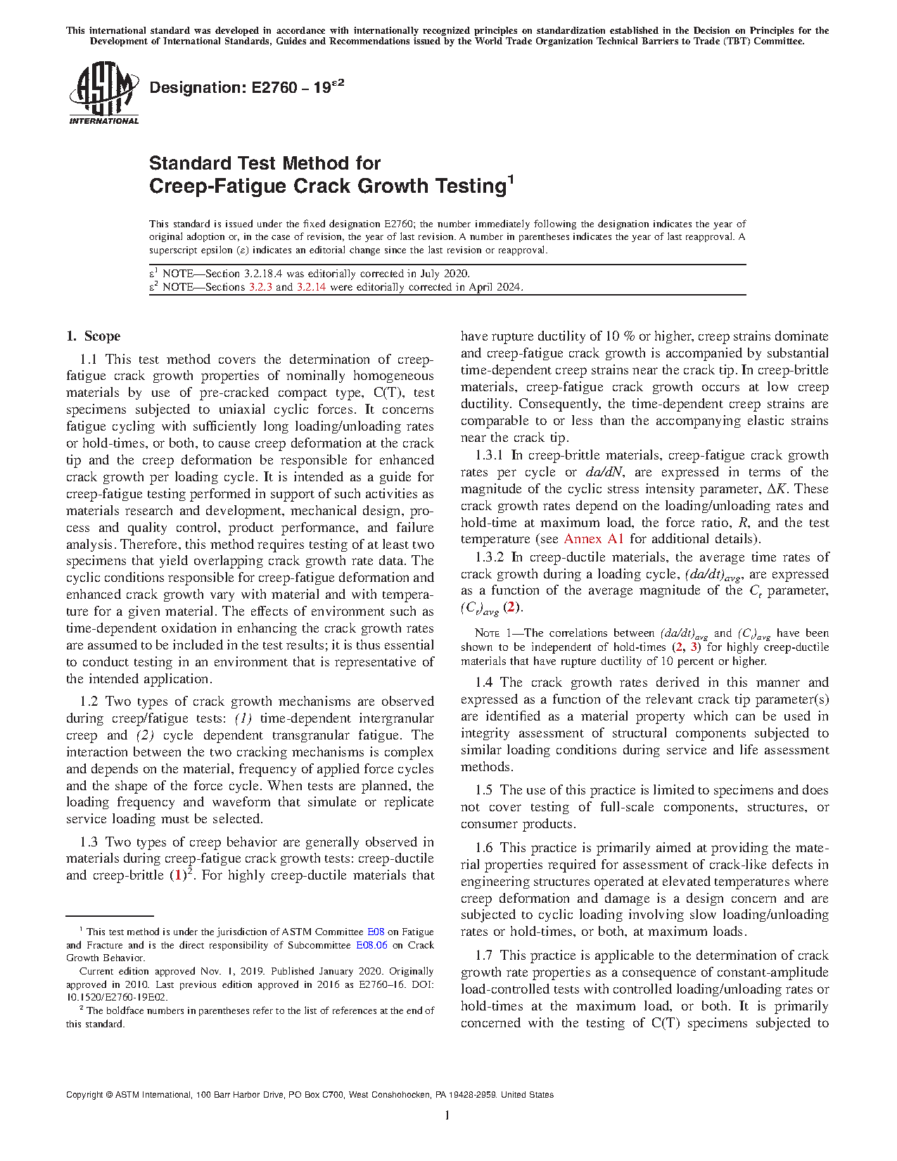 1.8 This practice is applicable to temperatures and hold-times for which the magnitudes of time-dependent inelastic strains at the crack tip are significant in comparison to the time-independent inelastic strains. No restrictions are placed on environmental factors such as temperature, pressure, humidity, medium and others, provided they are controlled throughout the test and are detailed in the data report.