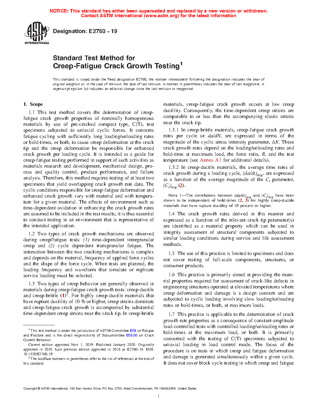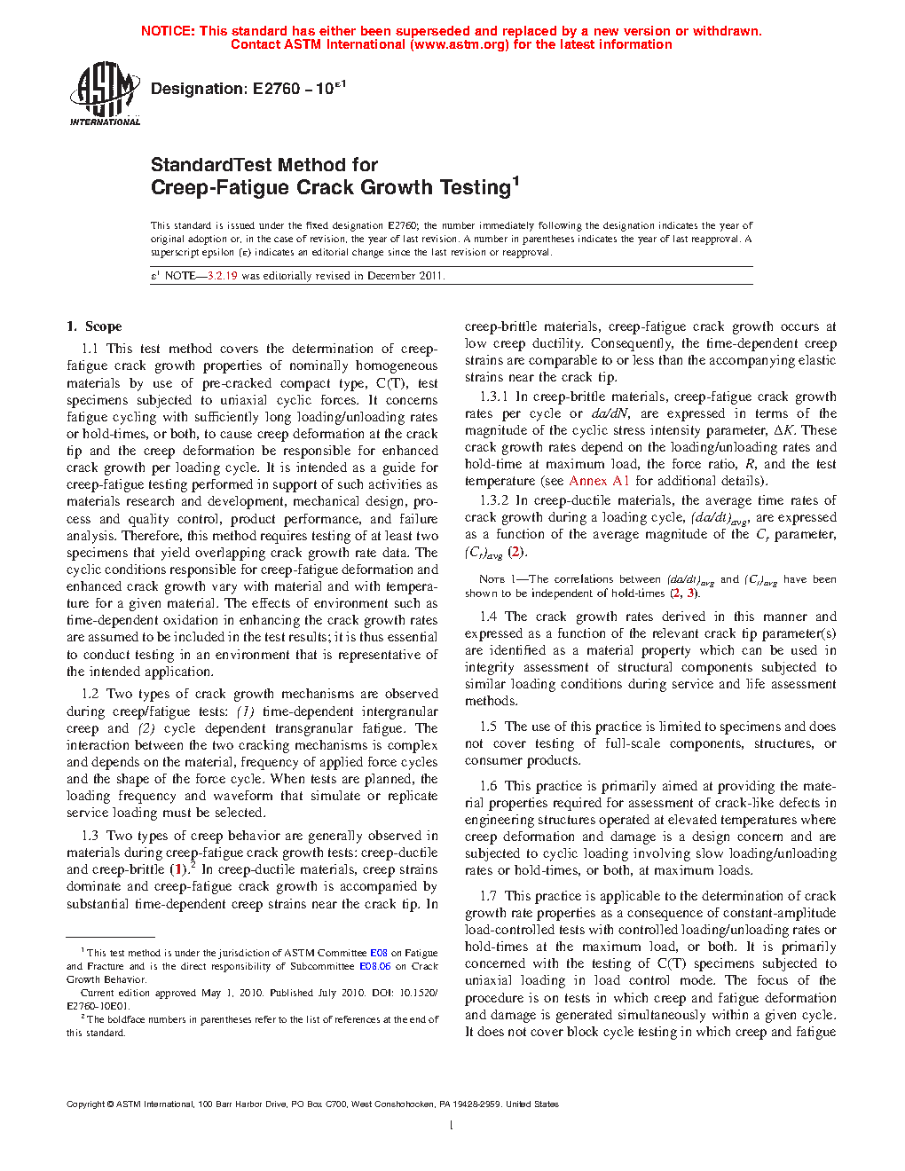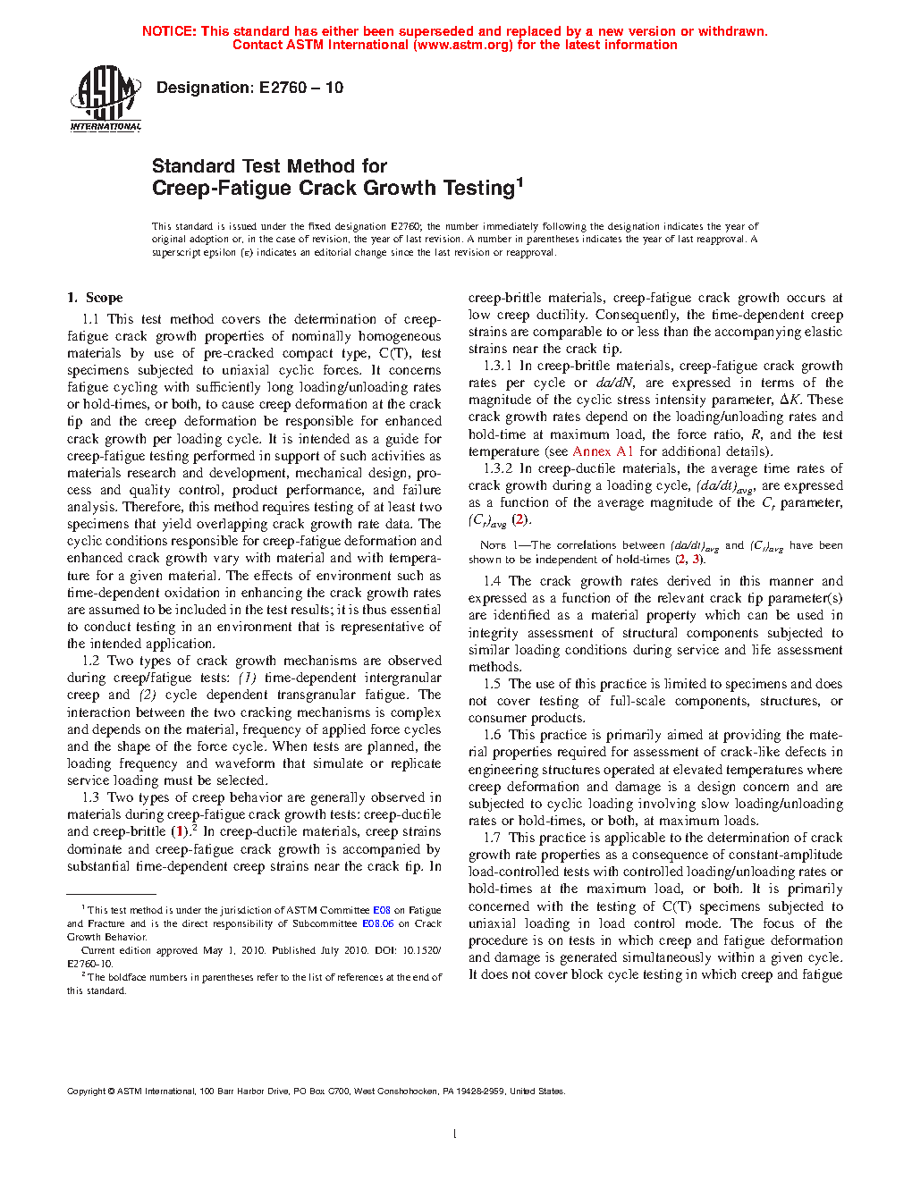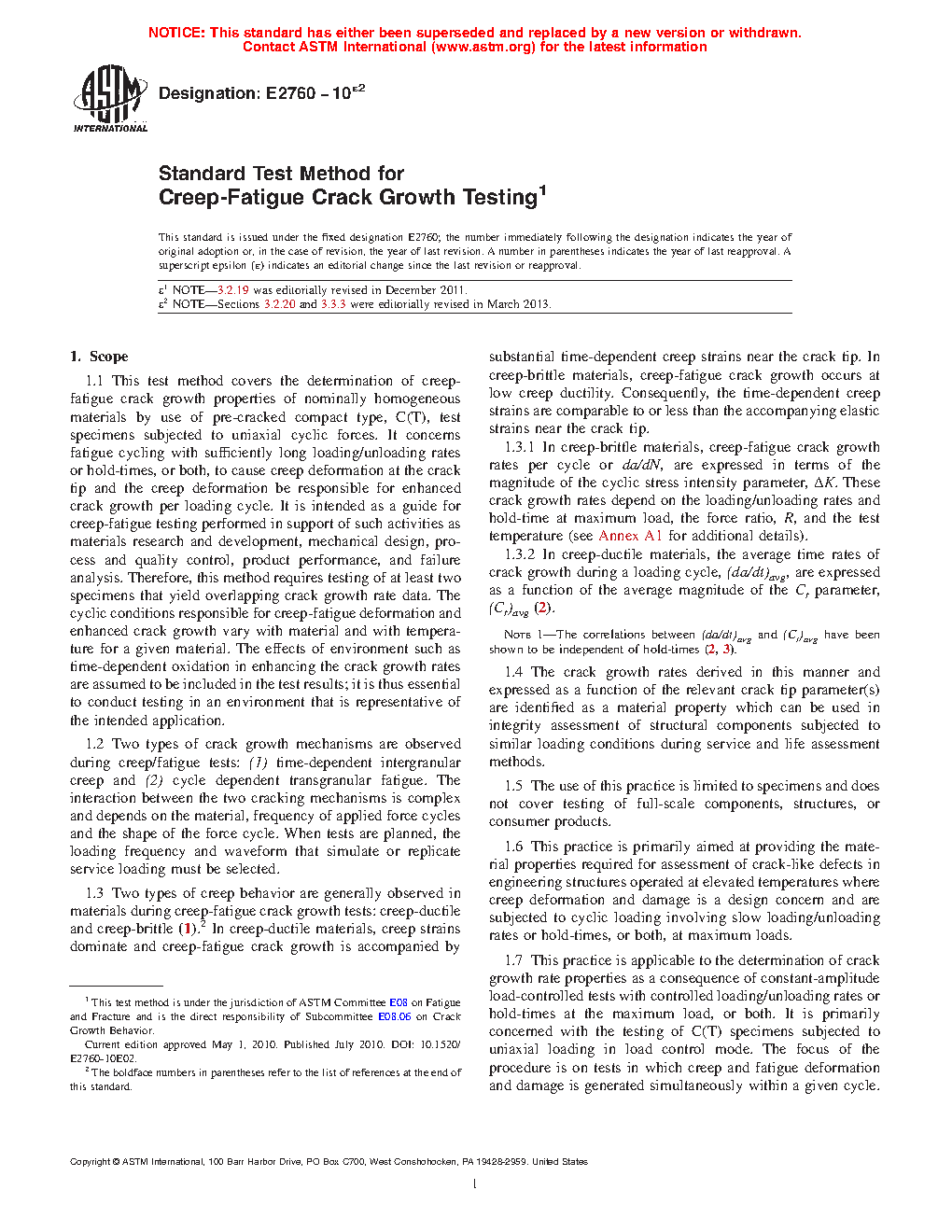 1.7 This practice is applicable to the determination of crack growth rate properties as a consequence of constant-amplitude load-controlled tests with controlled loading/unloading rates or hold-times at the maximum load, or both. It is primarily concerned with the testing of C(T) specimens subjected to uniaxial loading in load control mode. The focus of the procedure is on tests in which creep and fatigue deformation and damage is generated simultaneously within a given cycle. It does not cover block cycle testing in which creep and fatigue damage is generated sequentially. Data which may be determined from tests performed under such conditions may characterize the creep-fatigue crack growth behavior of the tested materials.