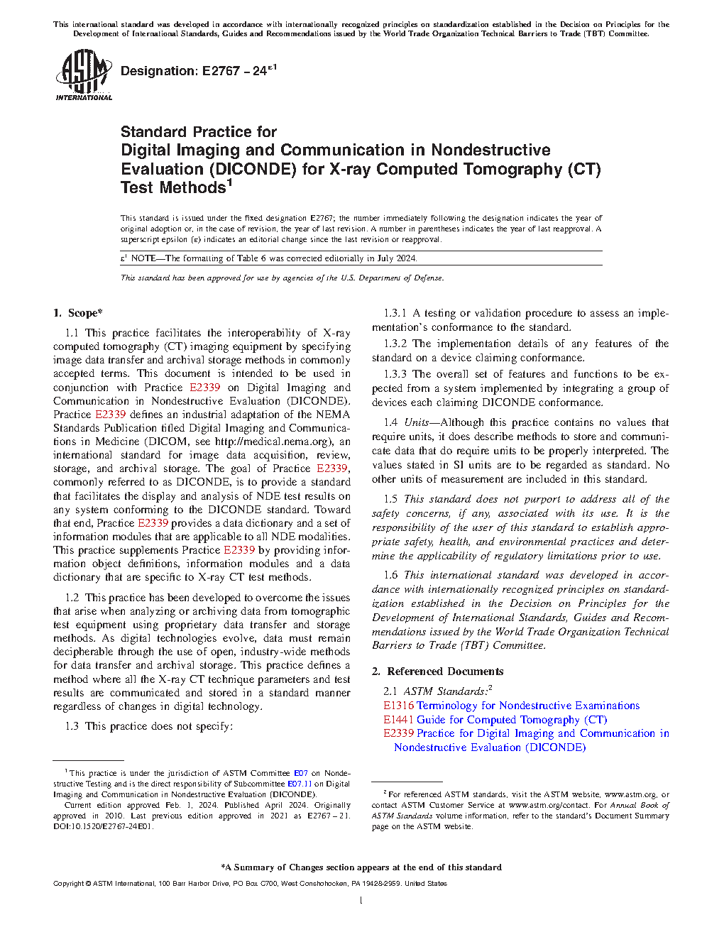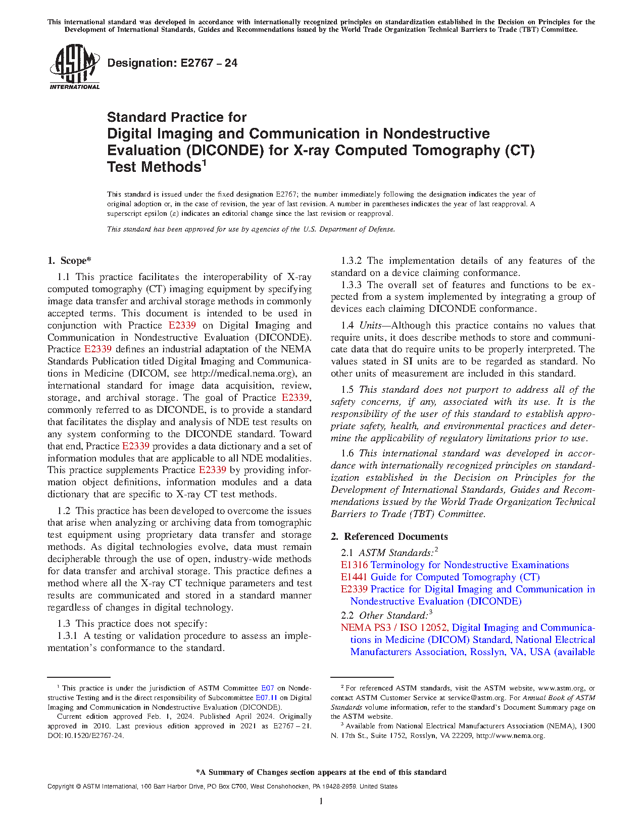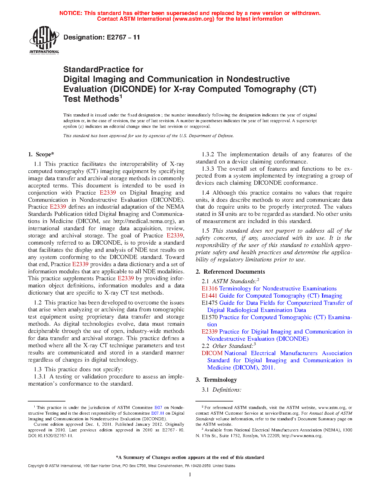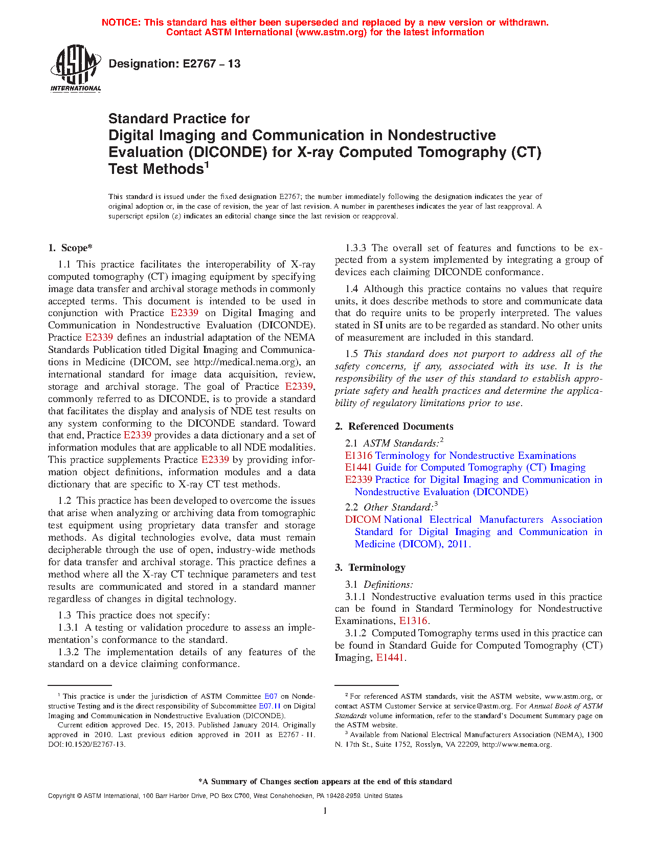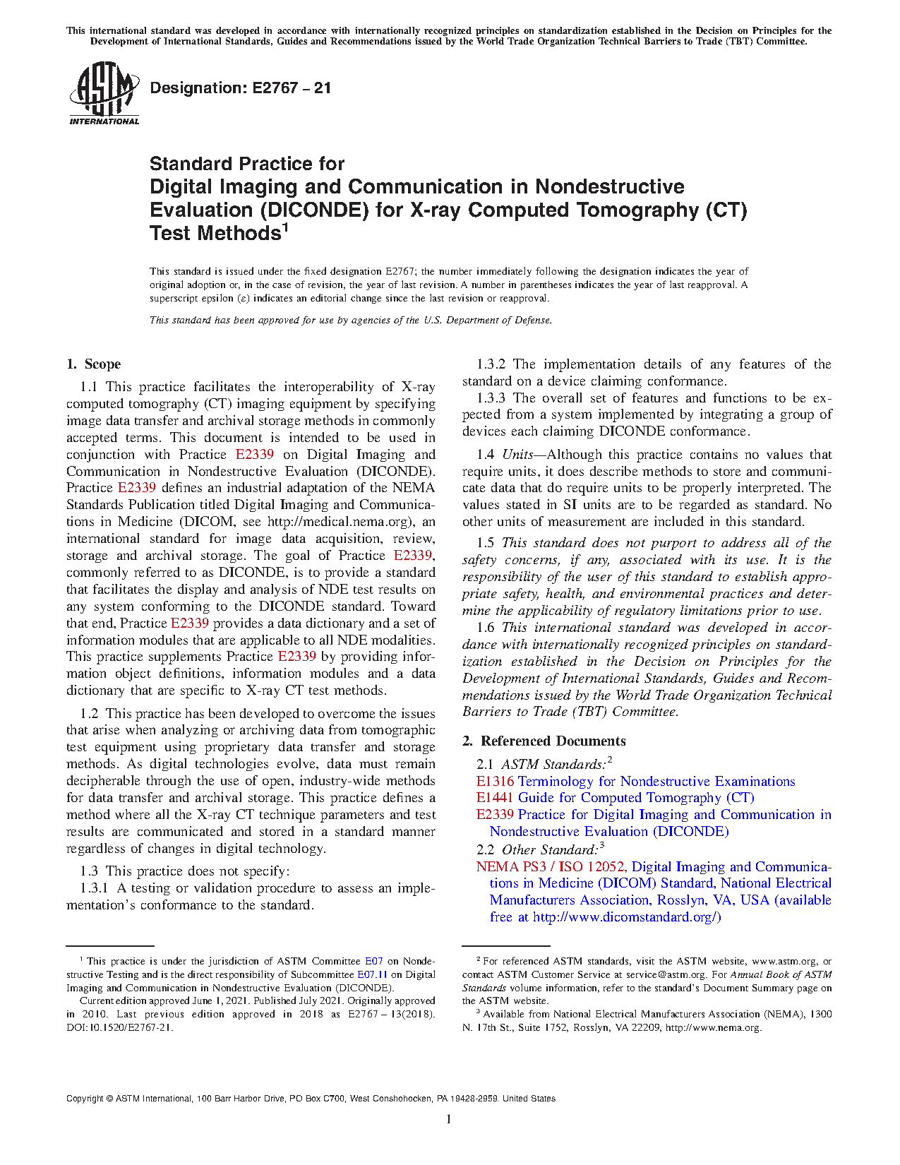 1.2 This practice has been developed to overcome the issues that arise when analyzing or archiving data from tomographic test equipment using proprietary data transfer and storage methods. As digital technologies evolve, data must remain decipherable through the use of open, industry-wide methods for data transfer and archival storage. This practice defines a method where all the X-ray CT technique parameters and test results are communicated and stored in a standard manner regardless of changes in digital technology.