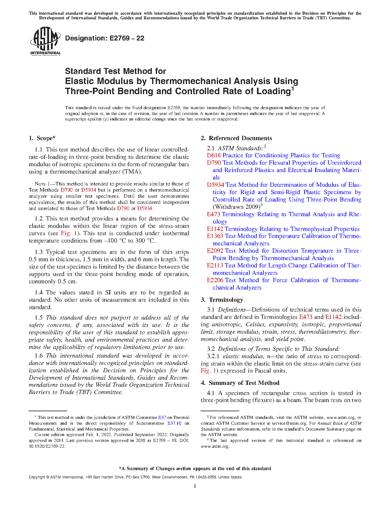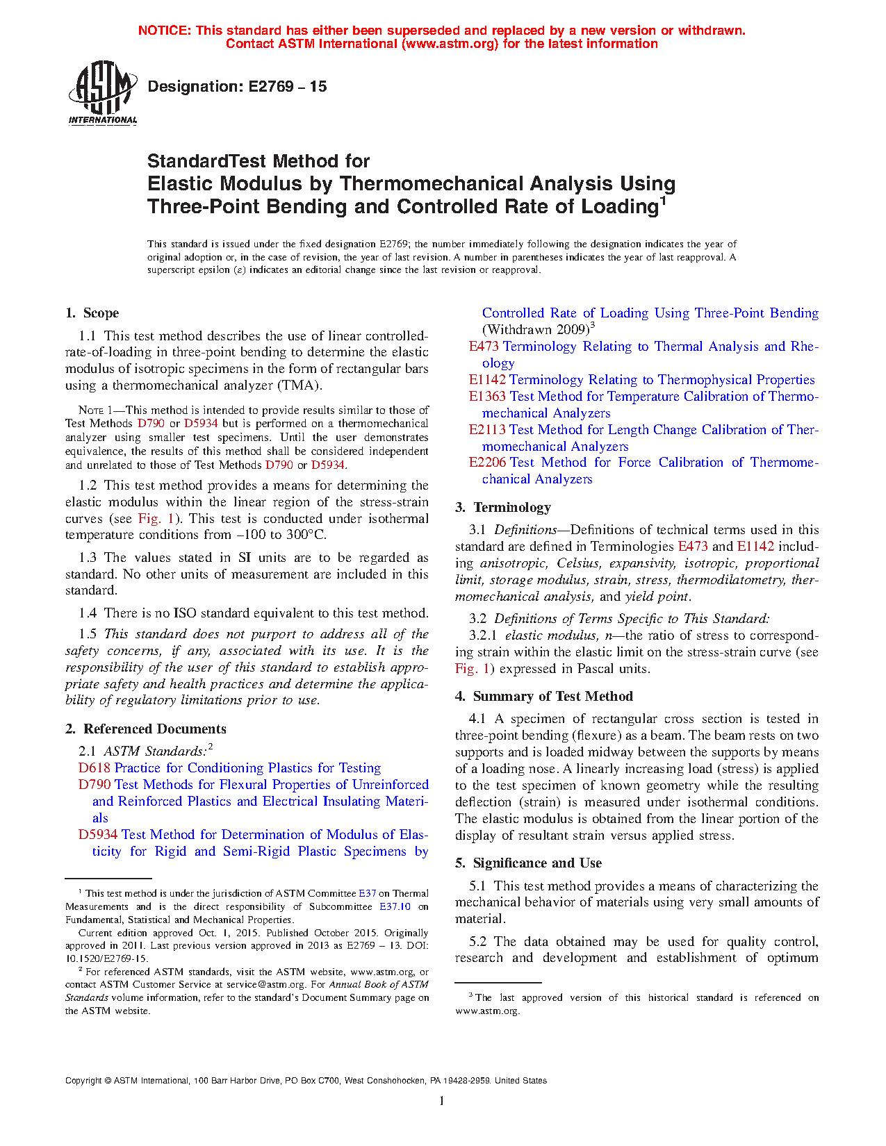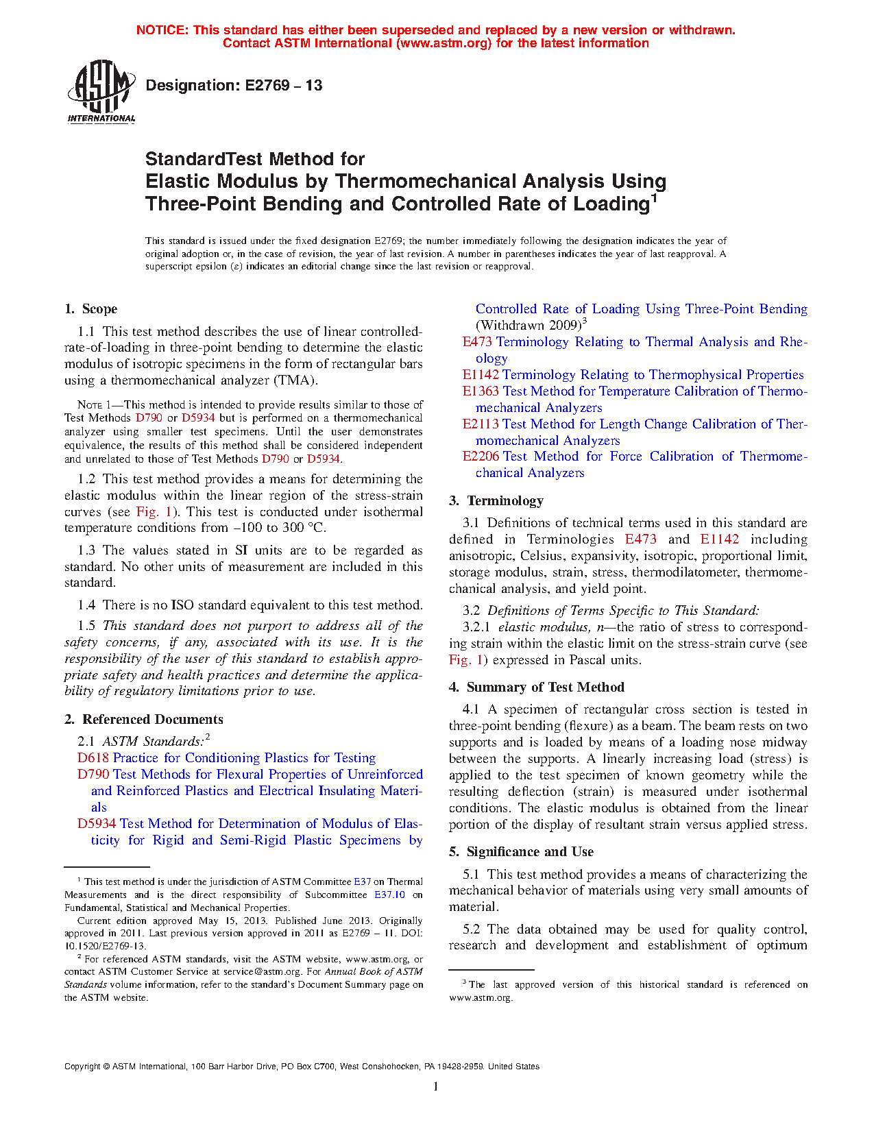 Note 1: This method is intended to provide results similar to those of Test Methods D790 or D5934 but is performed on a thermomechanical analyzer using smaller test specimens. Until the user demonstrates equivalence, the results of this method shall be considered independent and unrelated to those of Test Methods D790 or D5934.