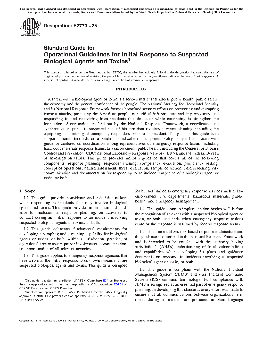 5.1 Community knowledge and experience related to emergency response to threats with a biological agent or toxin at the Federal, State, tribal, and local levels has been translated into a standard guide to assist responder agencies’ progress toward the goal of building operational guidelines for the sample collection and response to a potential biological agent or toxin. The guide is intended to enhance the ability, knowledge, and communication between emergency response team representatives, including fire department, HAZMAT, local law enforcement, Federal Bureau of Investigation, and public health personnel as well as other responders that are responsible for responding to a threat incident involving a biological agent or toxin, or both.