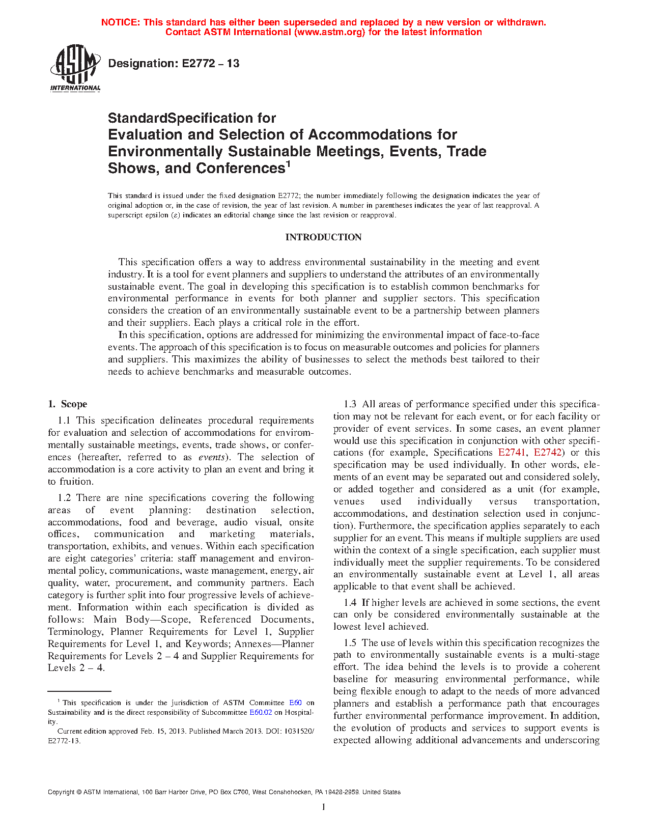 1.3 All areas of performance specified under this specification may not be relevant for each event, or for each facility or provider of event services. In some cases, an event planner would use this specification in conjunction with other specifications (for example, Specifications E2741, E2742) or this specification may be used individually. In other words, elements of an event may be separated out and considered solely, or added together and considered as a unit (for example, venues used individually versus transportation, accommodations, and destination selection used in conjunction). Furthermore, the specification applies separately to each supplier for an event. This means if multiple suppliers are used within the context of a single specification, each supplier must individually meet the supplier requirements. To be considered an environmentally sustainable event at Level 1, all areas applicable to that event shall be achieved.