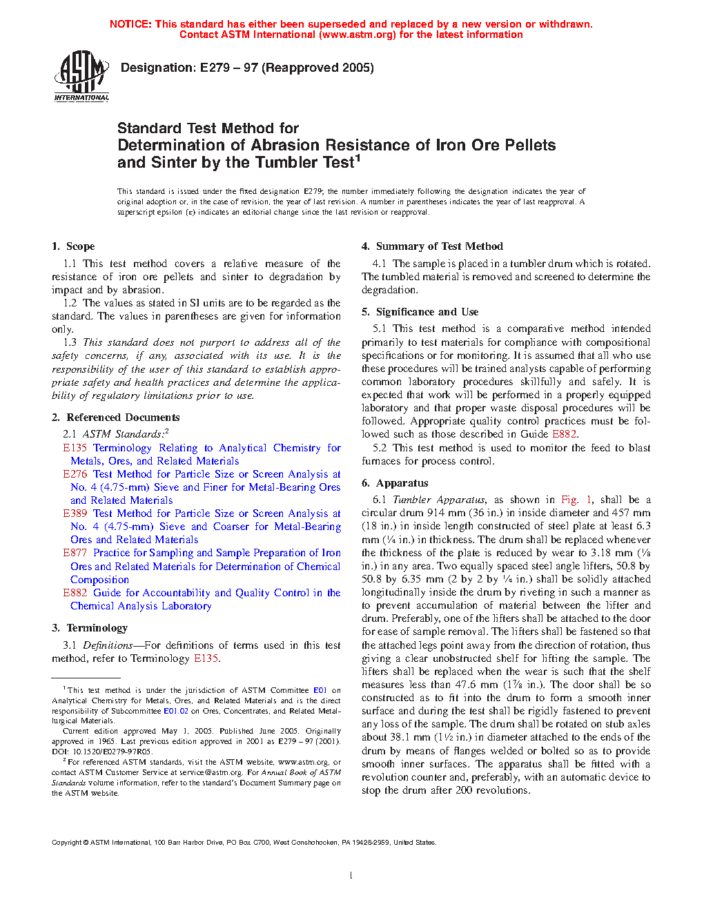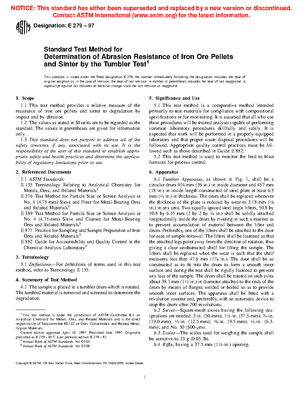 1.1 This test method covers a relative measure of the resistance of iron ore pellets, lump, and sinter to degradation by impact and by abrasion.