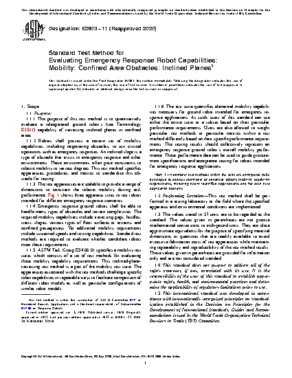 1.1.2 Robots shall possess a certain set of mobility capabilities, including negotiating obstacles, to suit critical operations such as emergency responses. An inclined slope is a type of obstacle that exists in emergency response and other environments. These environments often pose constraints to robotic mobility to various degrees. This test method specifies apparatuses, procedures, and metrics to standardize this obstacle for testing.