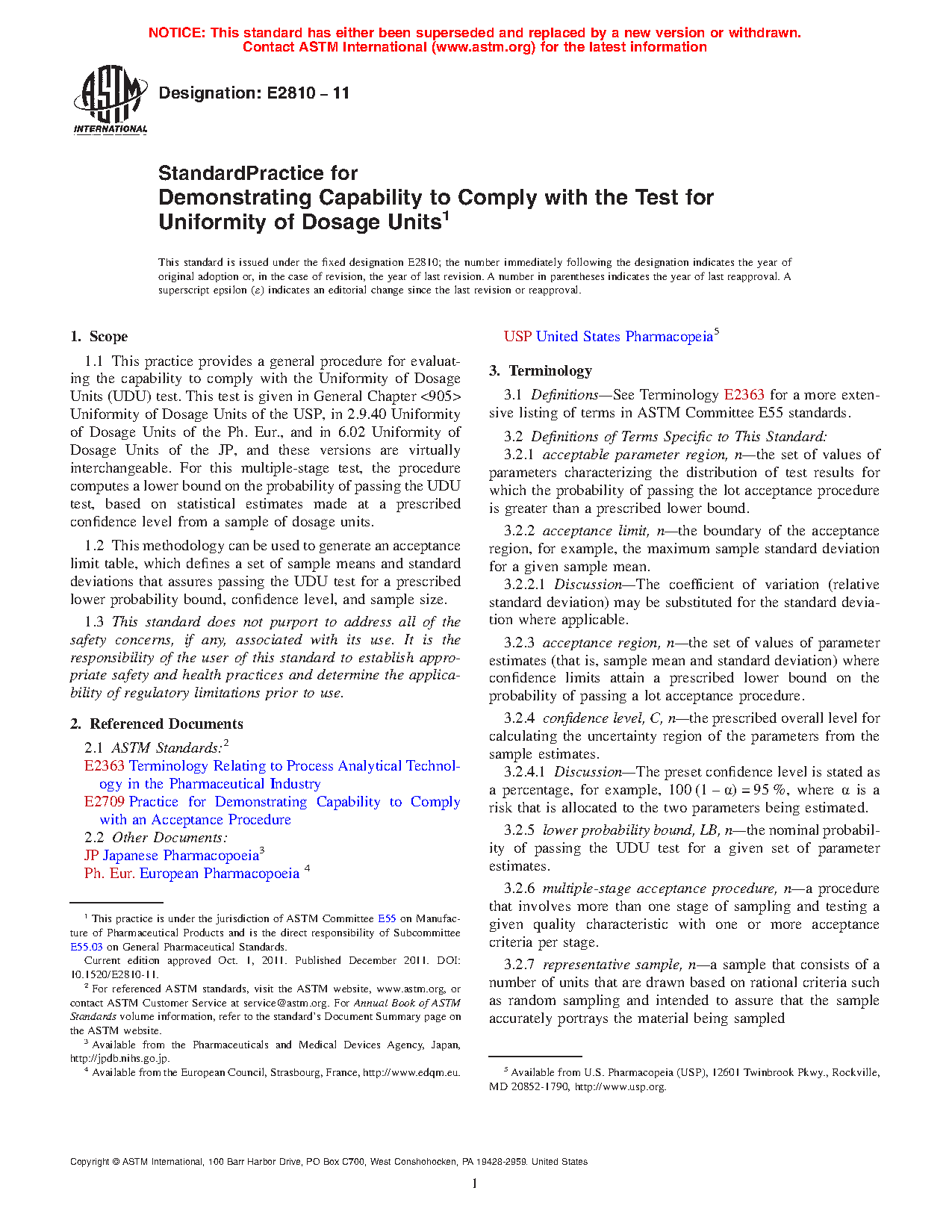 1.1 This practice provides a general procedure for evaluating the capability to comply with the Uniformity of Dosage Units (UDU) test. This test is given in General Chapter <905> Uniformity of Dosage Units of the USP, in 2.9.40 Uniformity of Dosage Units of the Ph. Eur., and in 6.02 Uniformity of Dosage Units of the JP, and these versions are virtually interchangeable. For this multiple-stage test, the procedure computes a lower bound on the probability of passing the UDU test, based on statistical estimates made at a prescribed confidence level from a sample of dosage units.