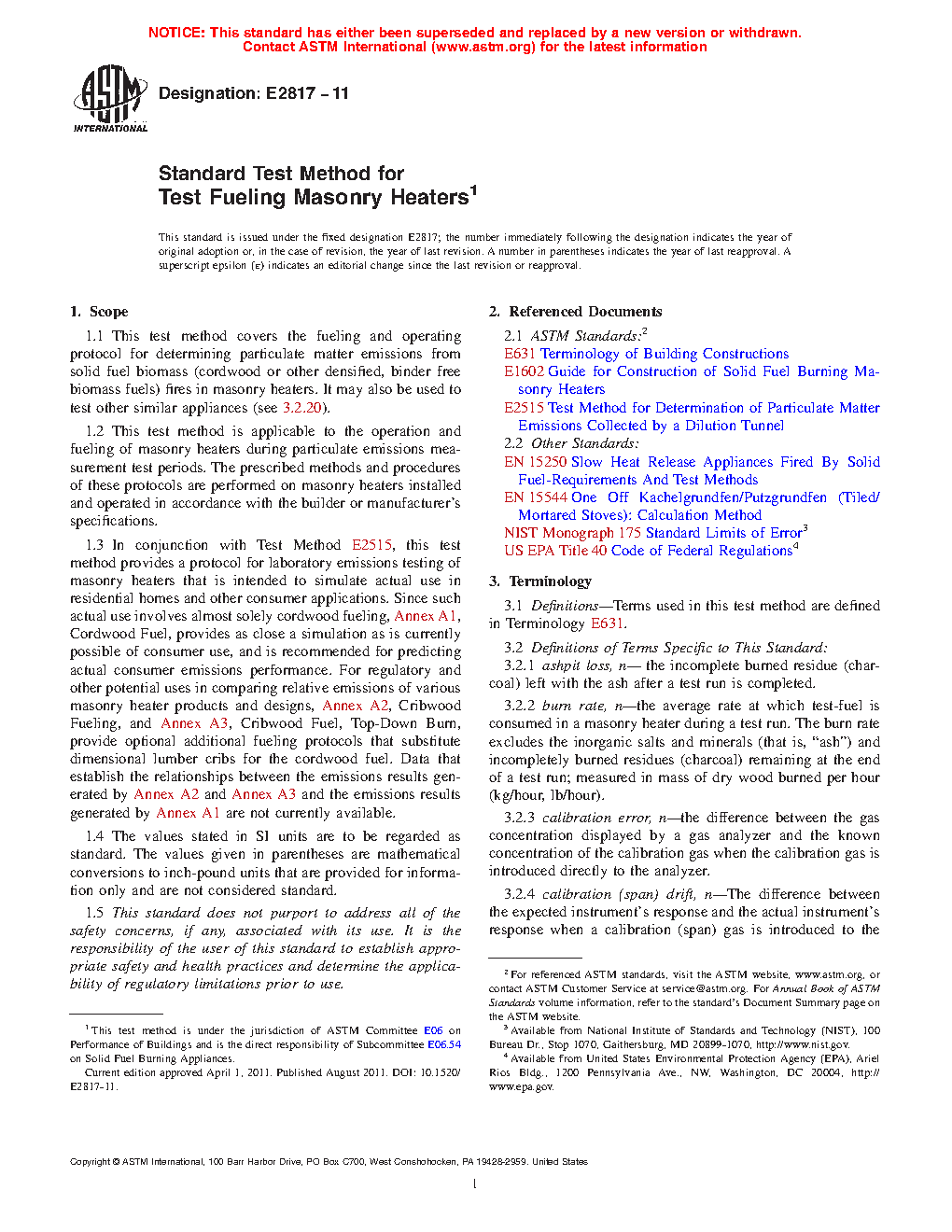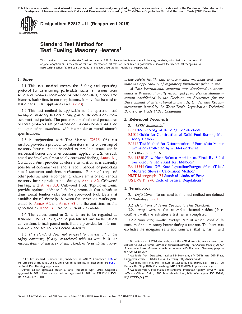 1.2 This test method is applicable to the operation and fueling of masonry heaters during particulate emissions measurement test periods. The prescribed methods and procedures of these protocols are performed on masonry heaters installed and operated in accordance with the builder or manufacturer’s specifications.