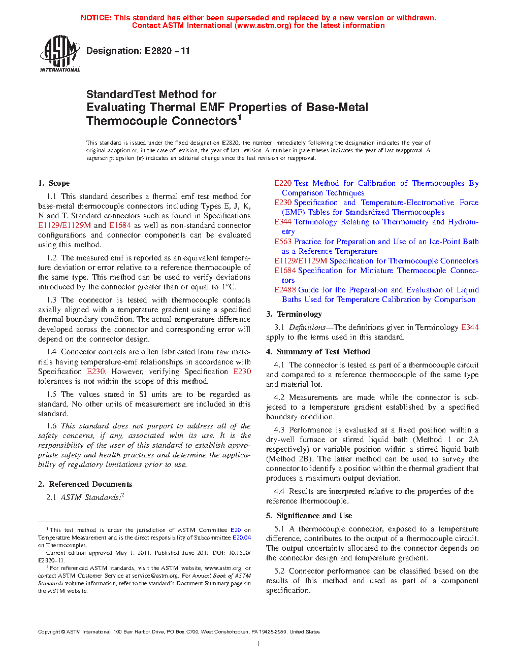 1.4 Connector contacts are often fabricated from raw materials having temperature-emf relationships in accordance with Specification E230. However, verifying Specification E230 tolerances is not within the scope of this method.