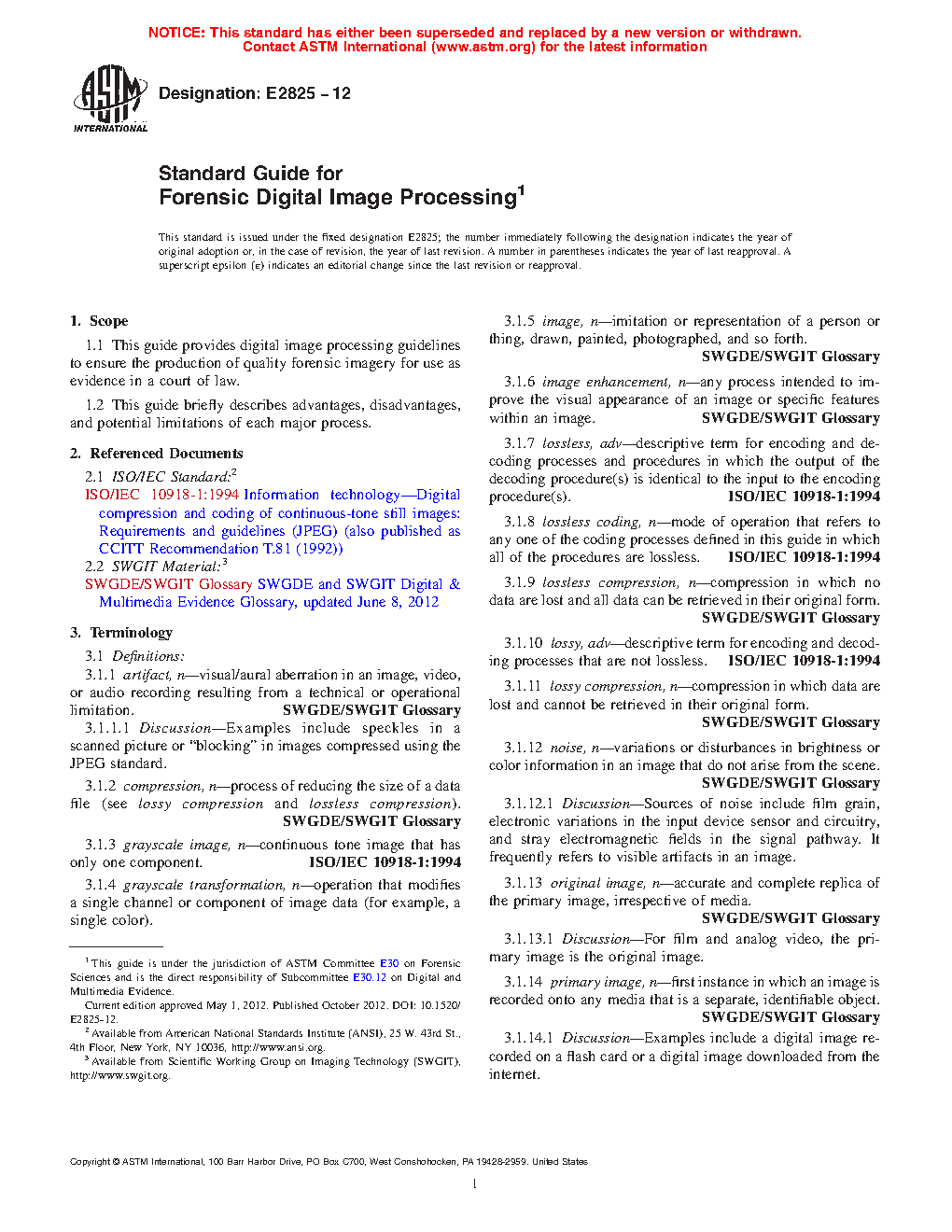 1.1 This guide provides digital image processing guidelines to ensure the production of quality forensic imagery for use as evidence in a court of law.