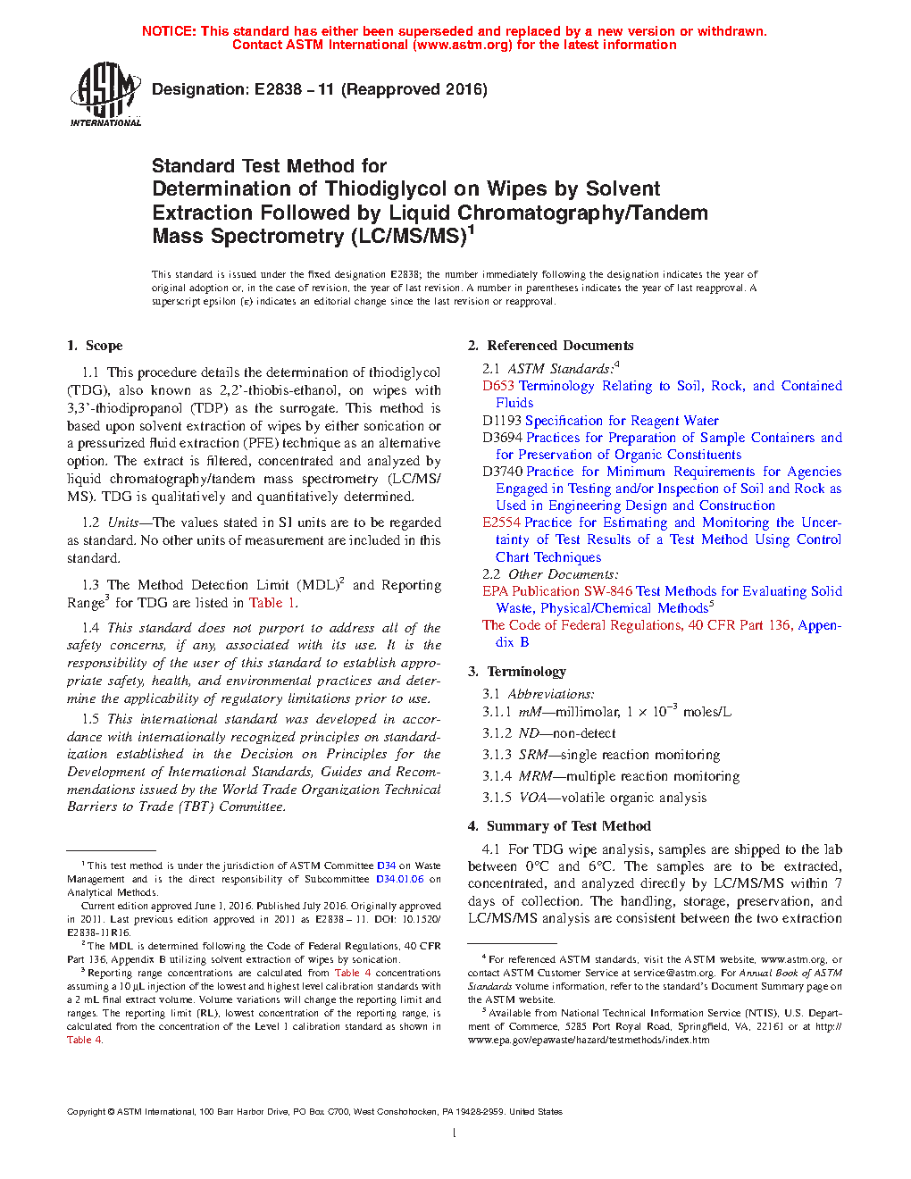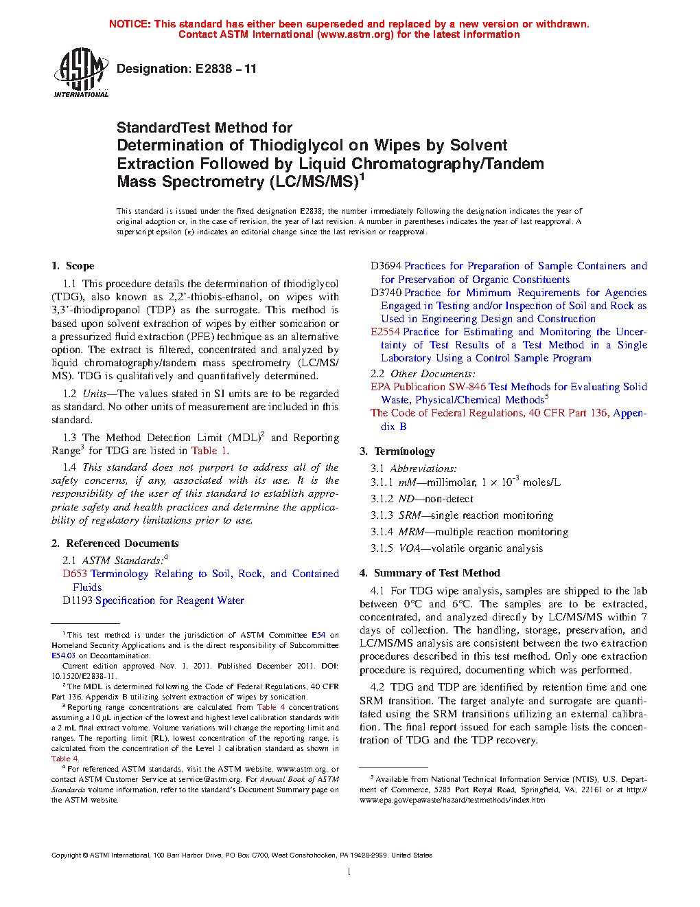 1.1 This procedure details the determination of thiodiglycol (TDG), also known as 2,2’-thiobis-ethanol, on wipes with 3,3’-thiodipropanol (TDP) as the surrogate. This method is based upon solvent extraction of wipes by either sonication or a pressurized fluid extraction (PFE) technique as an alternative option. The extract is filtered, concentrated and analyzed by liquid chromatography/tandem mass spectrometry (LC/MS/MS). TDG is qualitatively and quantitatively determined.