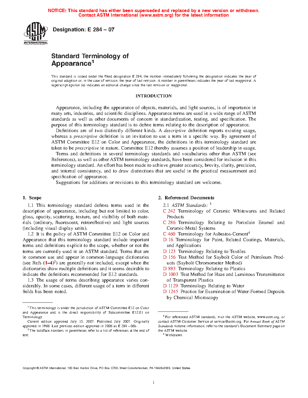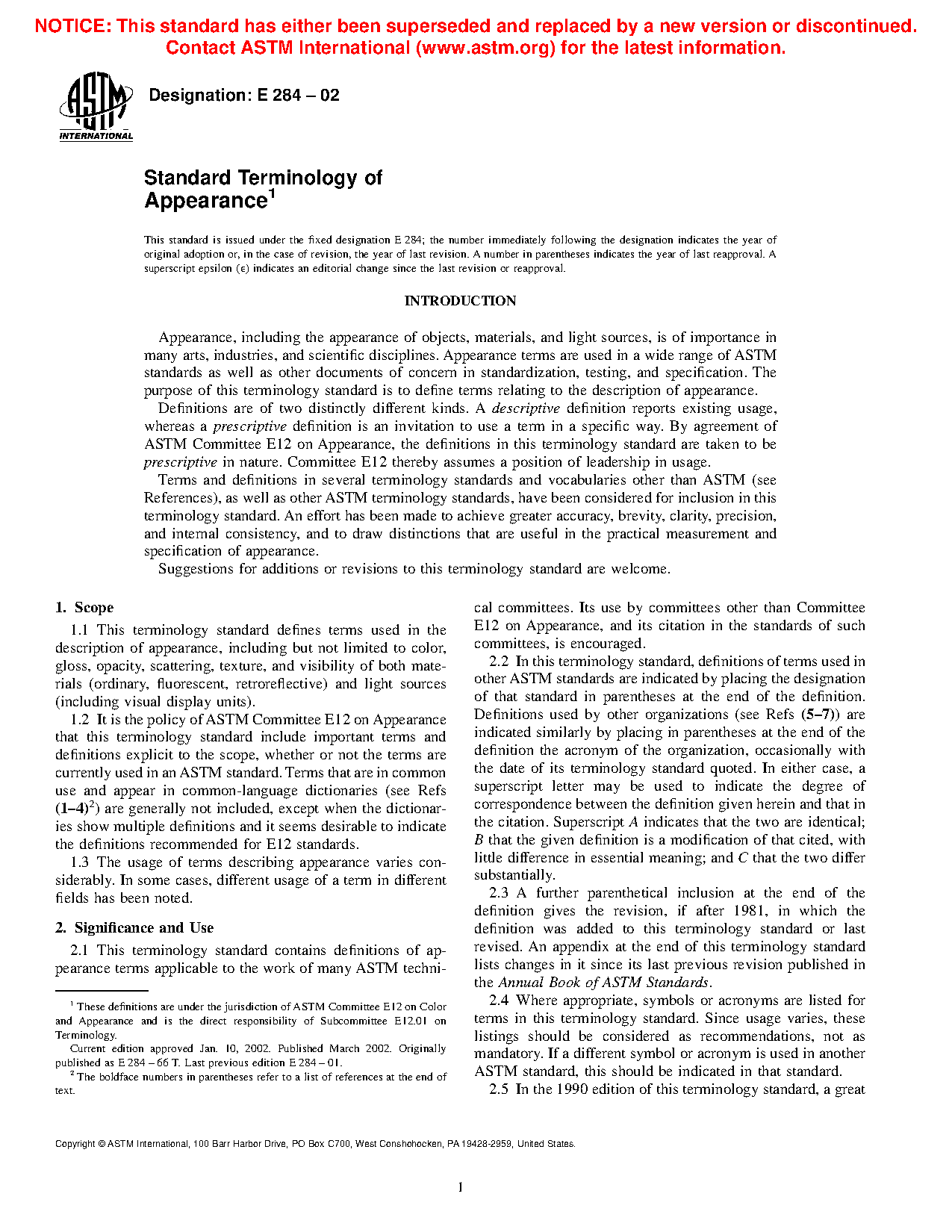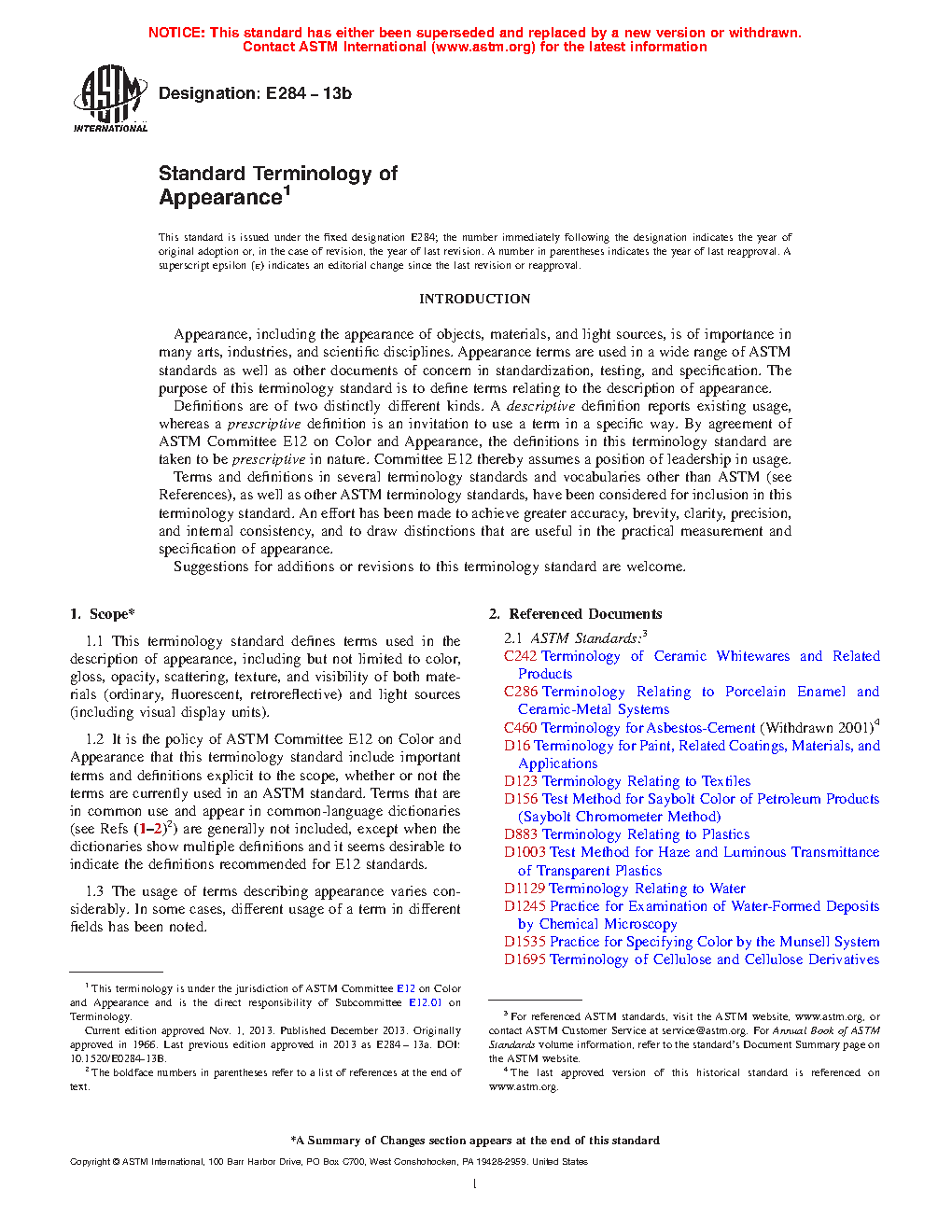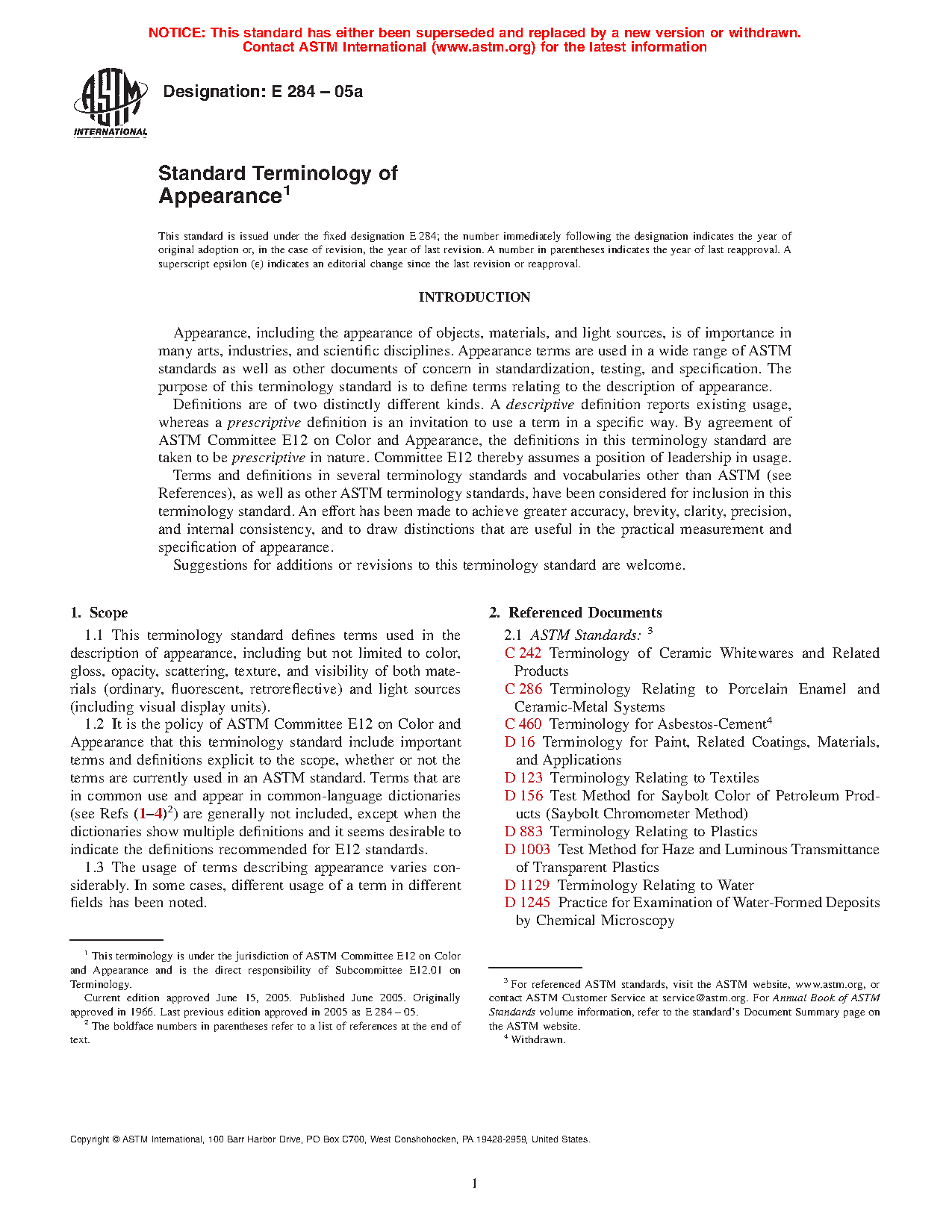 1.1 This terminology standard defines terms used in the description of appearance, including but not limited to color, gloss, opacity, scattering, texture, and visibility of both materials (ordinary, fluorescent, retroreflective) and light sources (including visual display units).