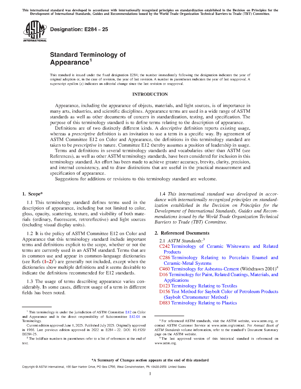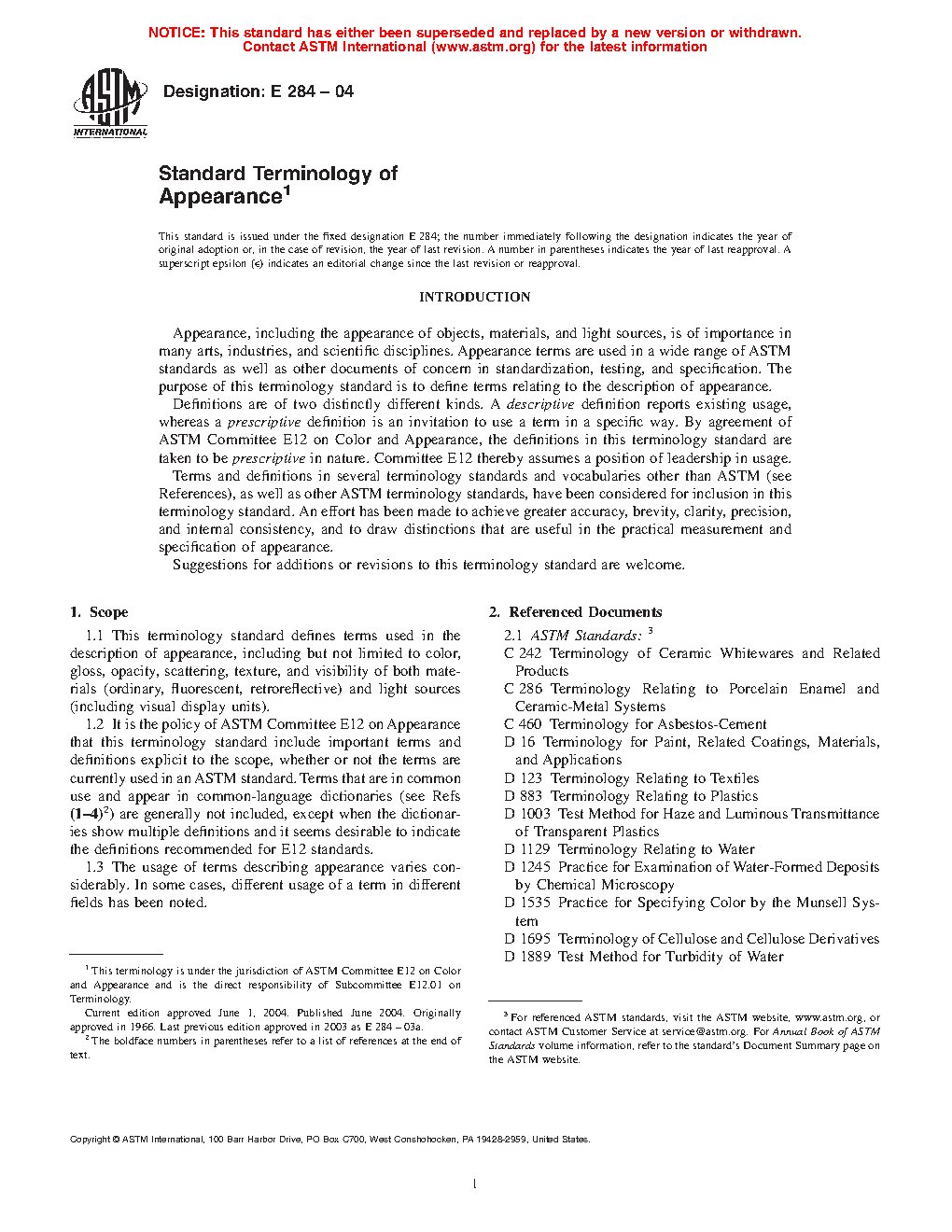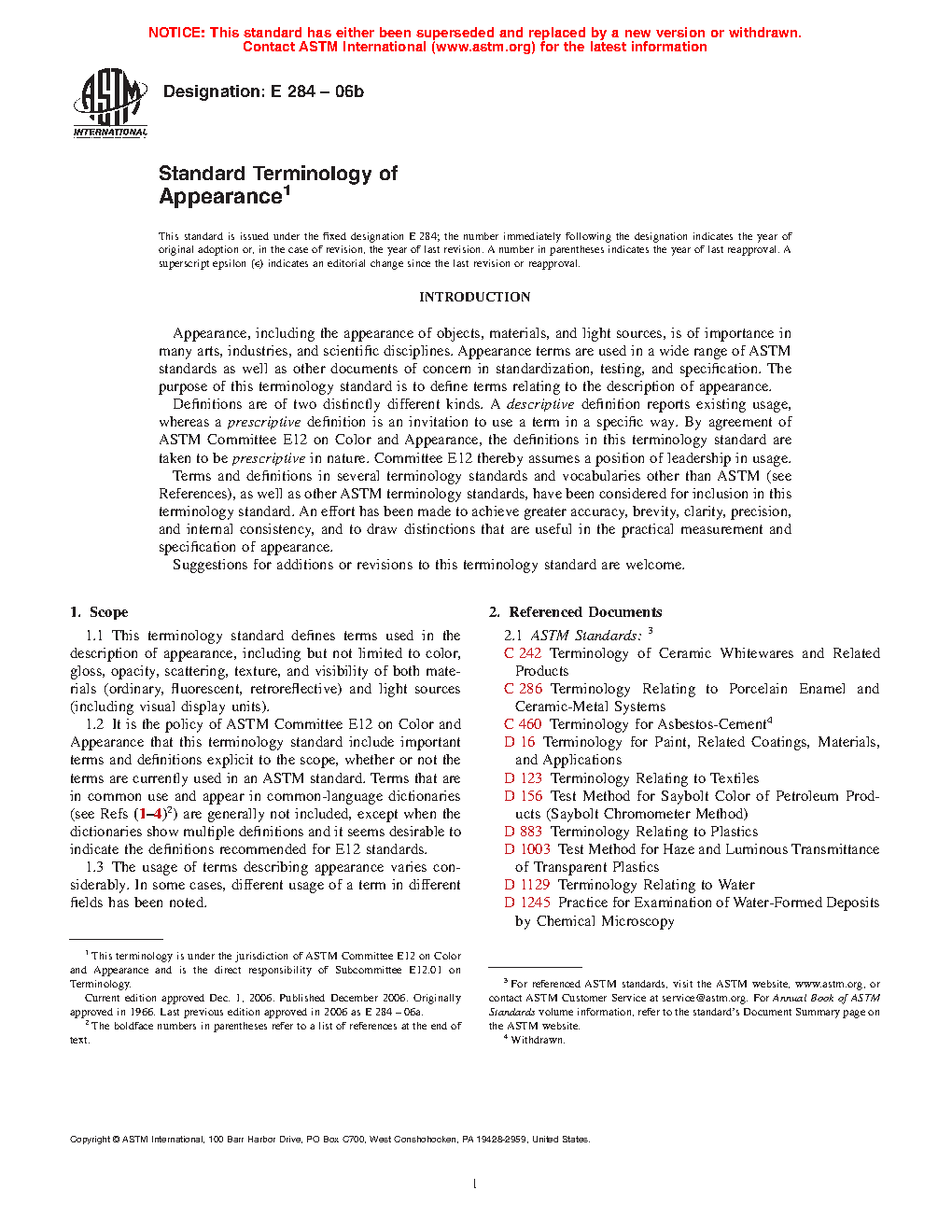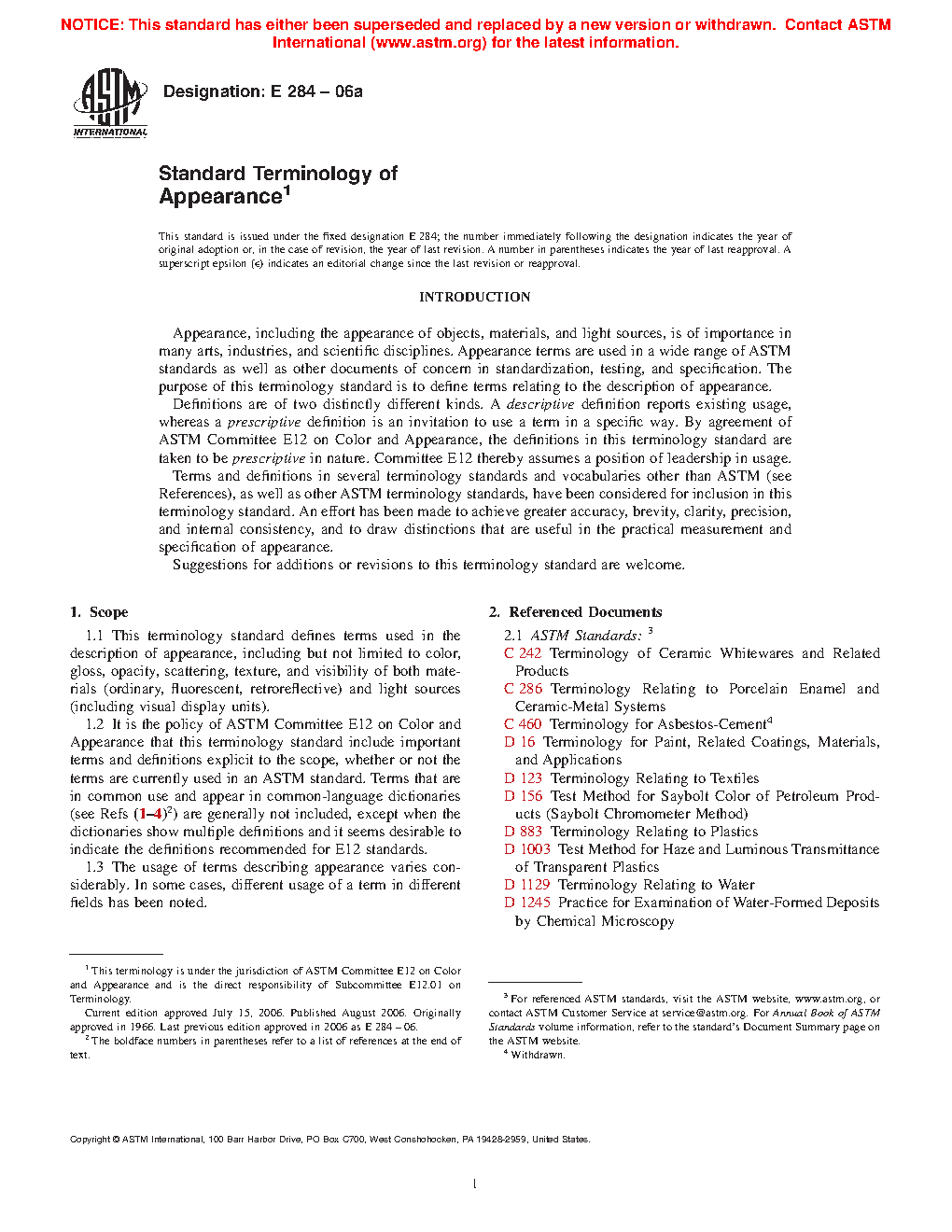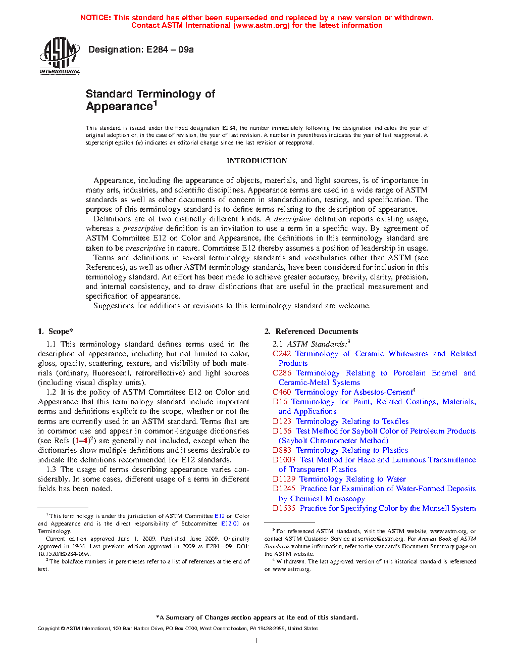 1.1 This terminology standard defines terms used in the description of appearance, including but not limited to color, gloss, opacity, scattering, texture, and visibility of both materials (ordinary, fluorescent, retroreflective) and light sources (including visual display units).
