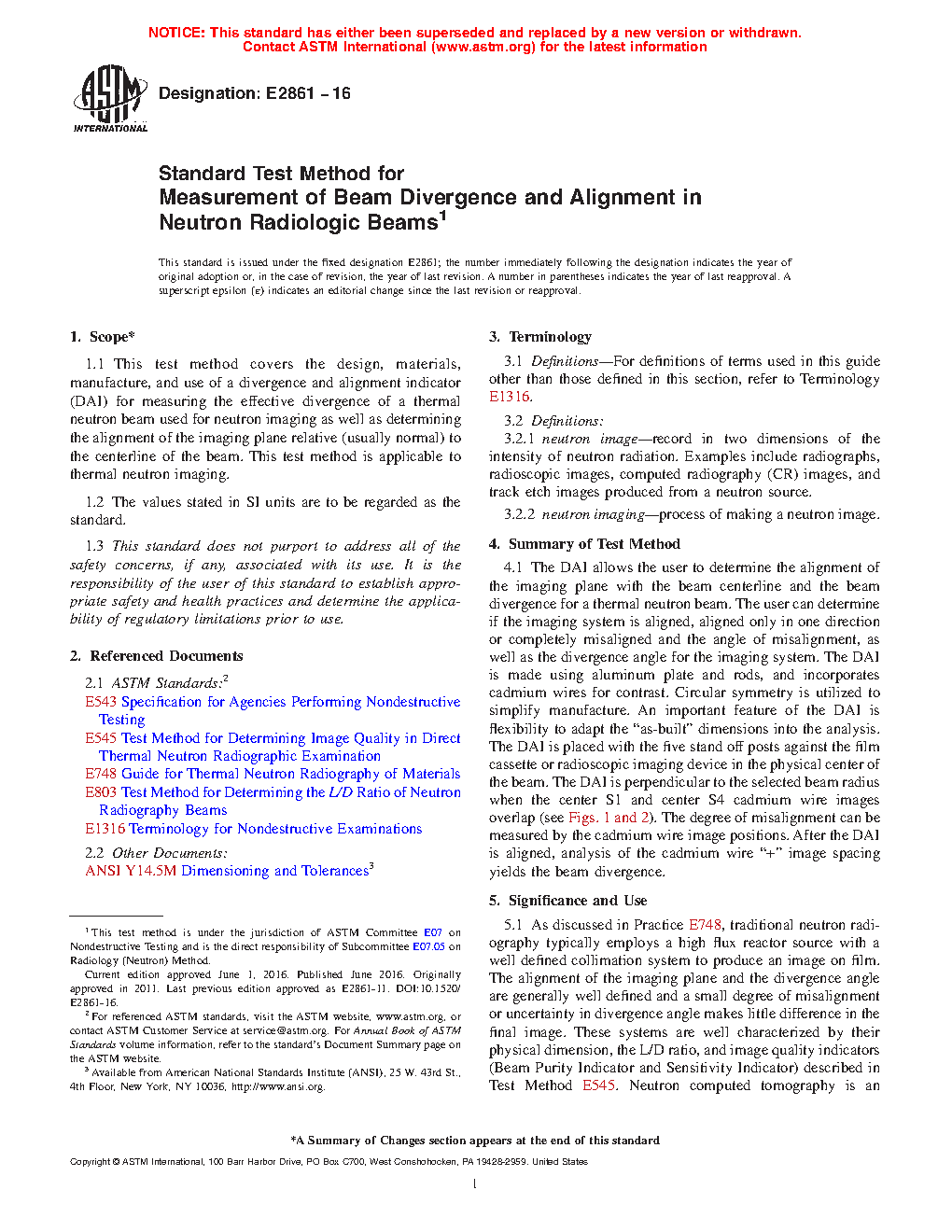 1.1 This test method covers the design, materials, manufacture, and use of a divergence and alignment indicator (DAI) for measuring the effective divergence of a thermal neutron beam used for neutron imaging as well as determining the alignment of the imaging plane relative (usually normal) to the centerline of the beam. This test method is applicable to thermal neutron imaging.