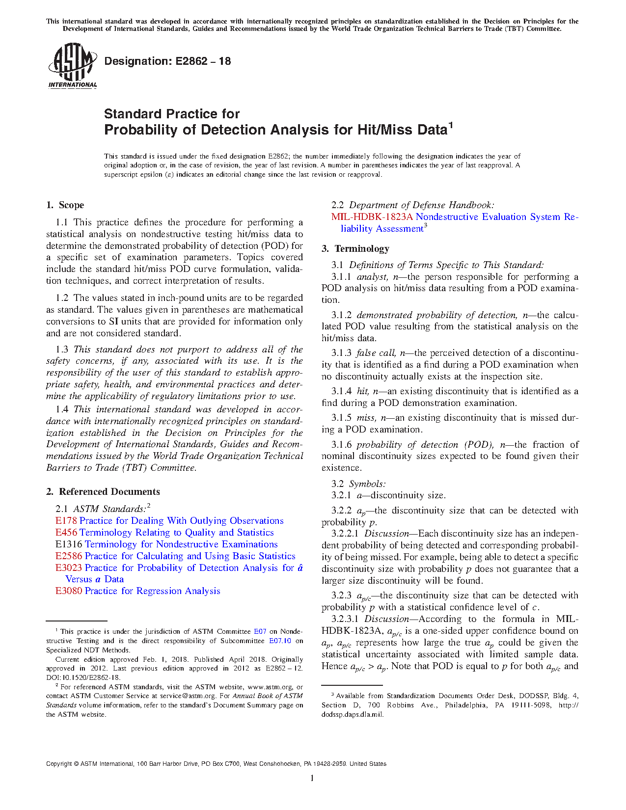 1.1 This practice defines the procedure for performing a statistical analysis on nondestructive testing hit/miss data to determine the demonstrated probability of detection (POD) for a specific set of examination parameters. Topics covered include the standard hit/miss POD curve formulation, validation techniques, and correct interpretation of results.