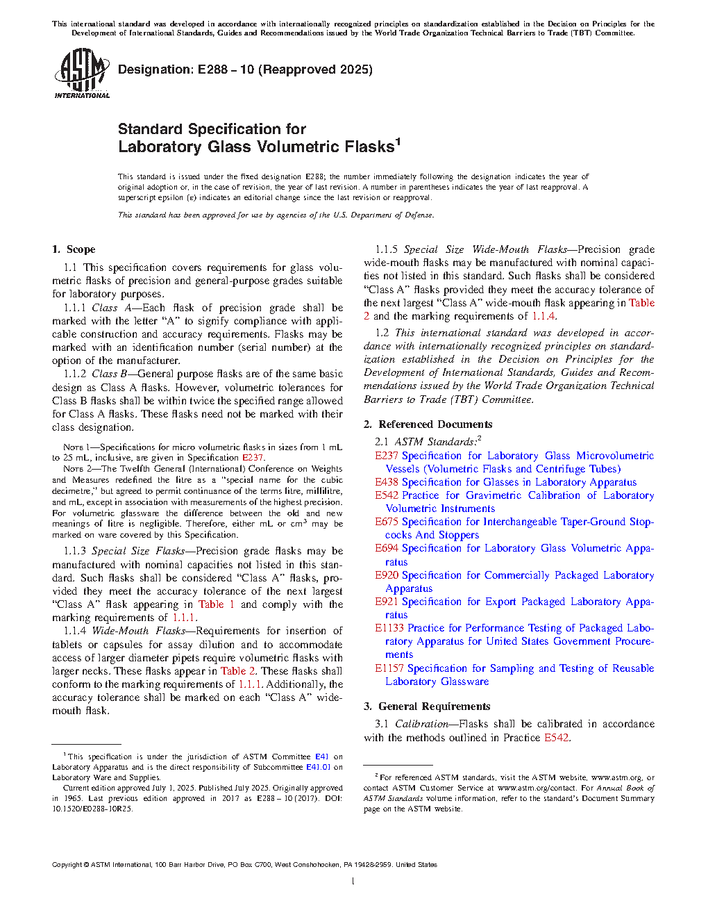 1.1 This specification covers requirements for glass volumetric flasks of precision and general-purpose grades suitable for laboratory purposes.