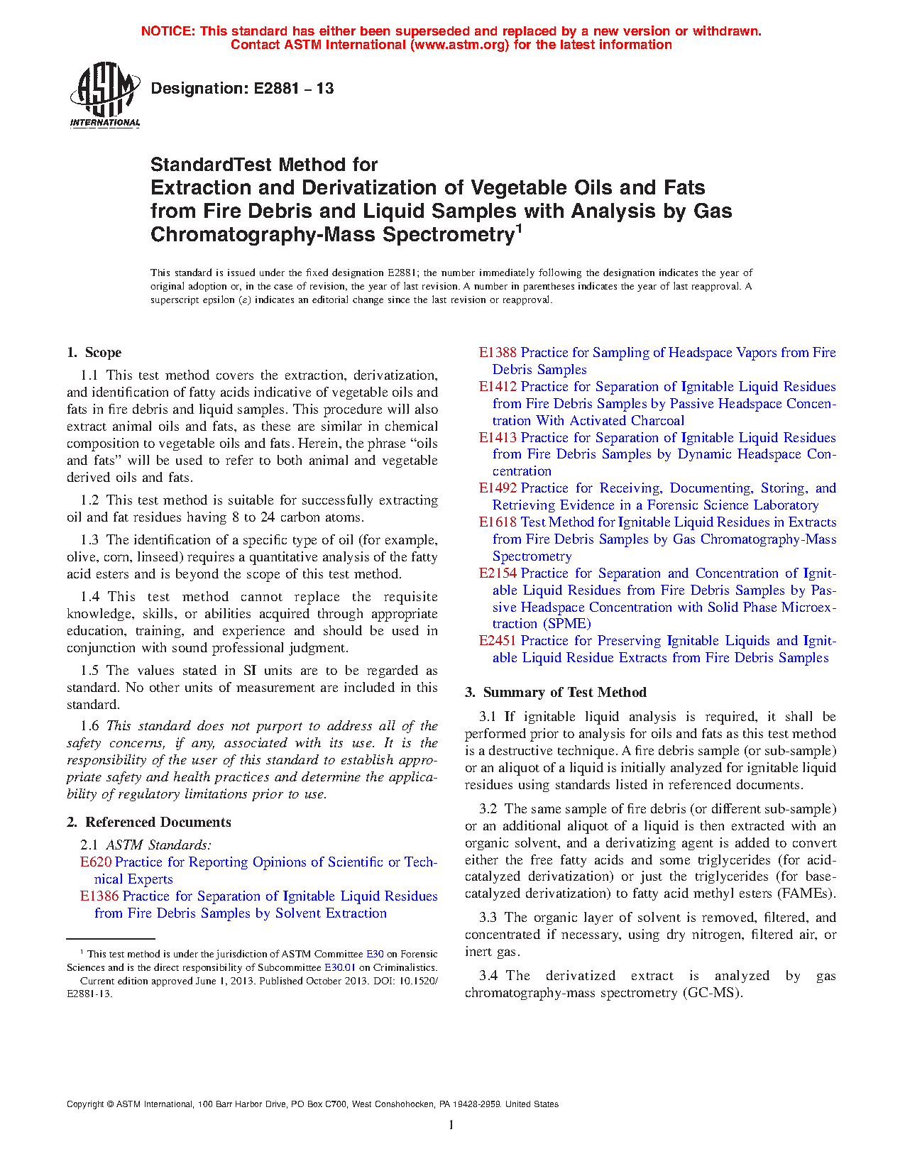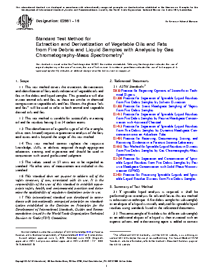 1.1 This test method covers the extraction, derivatization, and identification of fatty acids indicative of vegetable oils and fats in fire debris and liquid samples. This procedure will also extract animal oils and fats, as these are similar in chemical composition to vegetable oils and fats. Herein, the phrase “oils and fats” will be used to refer to both animal and vegetable derived oils and fats.