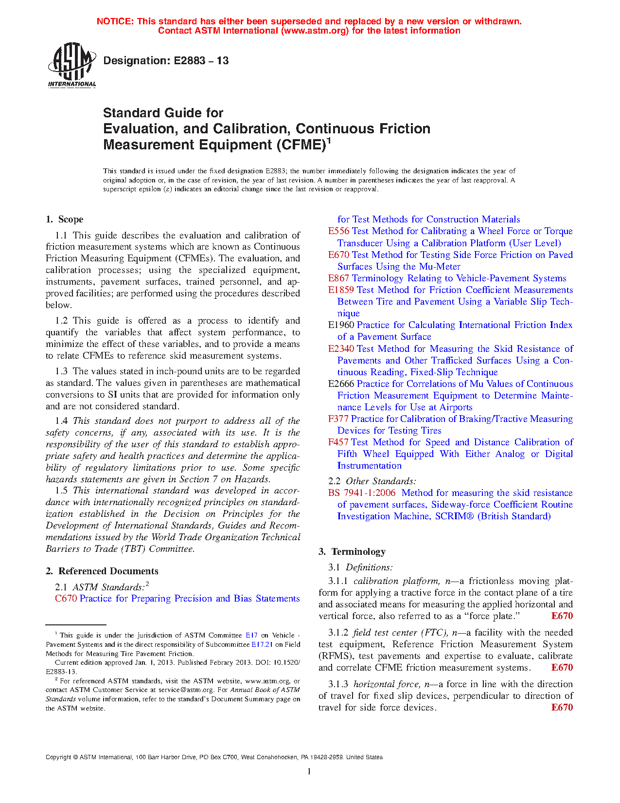1.1 This guide describes the evaluation and calibration of friction measurement systems which are known as Continuous Friction Measuring Equipment (CFMEs). The evaluation and calibration processes, using the specialized equipment, instruments, pavement surfaces, trained personnel, and approved facilities, are performed using the procedures described below.