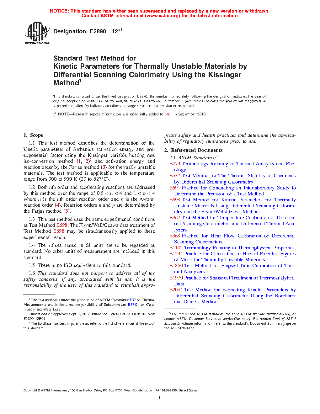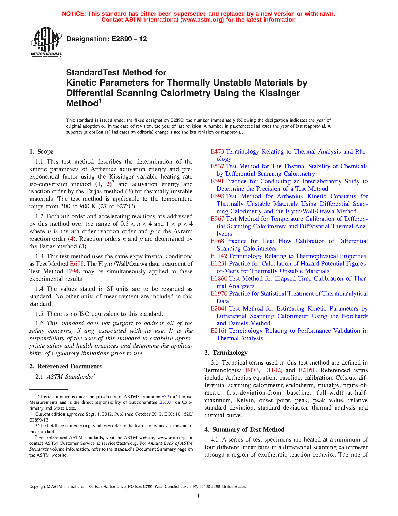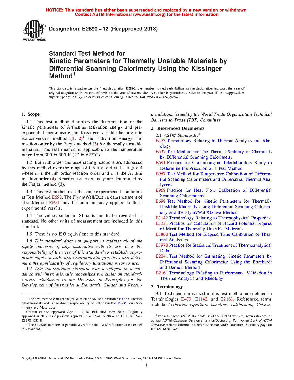 1.1 This test method describes the determination of the kinetic parameters of Arrhenius activation energy and pre-exponential factor using the Kissinger variable heating rate iso-conversion method (1, 2)2 and activation energy and reaction order by the Farjas method (3) for thermally unstable materials. The test method is applicable to the temperature range from 300 K to 900 K (27 °C to 627 °C).