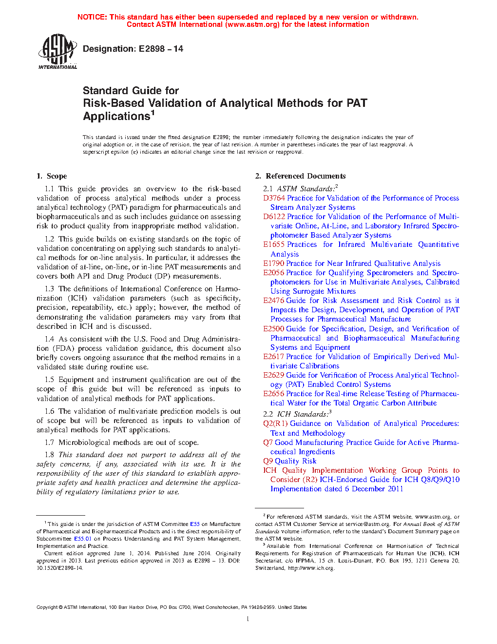 1.1 This guide provides an overview to the risk-based validation of process analytical methods under a process analytical technology (PAT) paradigm for pharmaceuticals and biopharmaceuticals and as such includes guidance on assessing risk to product quality from inappropriate method validation.