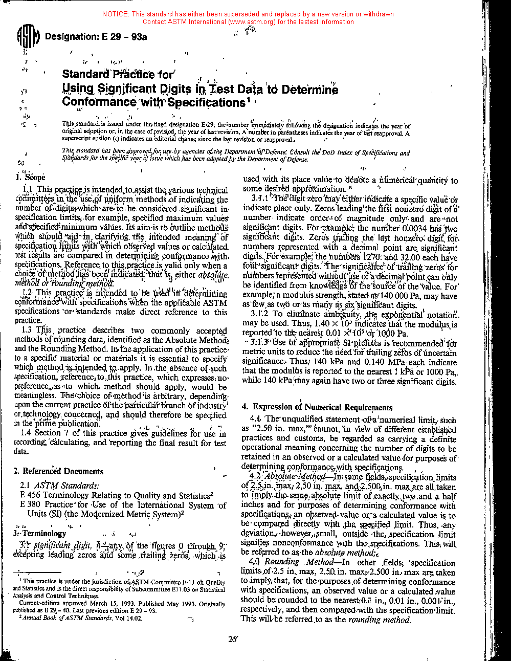 1.1 This practice is intended to assist the various technical committees in the use of uniform methods of indicating the number of digits which are to be considered significant in specification limits, for example, specified maximum values and specified minimum values. Its aim is to outline methods which should aid in clarifying the intended meaning of specification limits with which observed values or calculated test results are compared in determining conformance with specifications.
