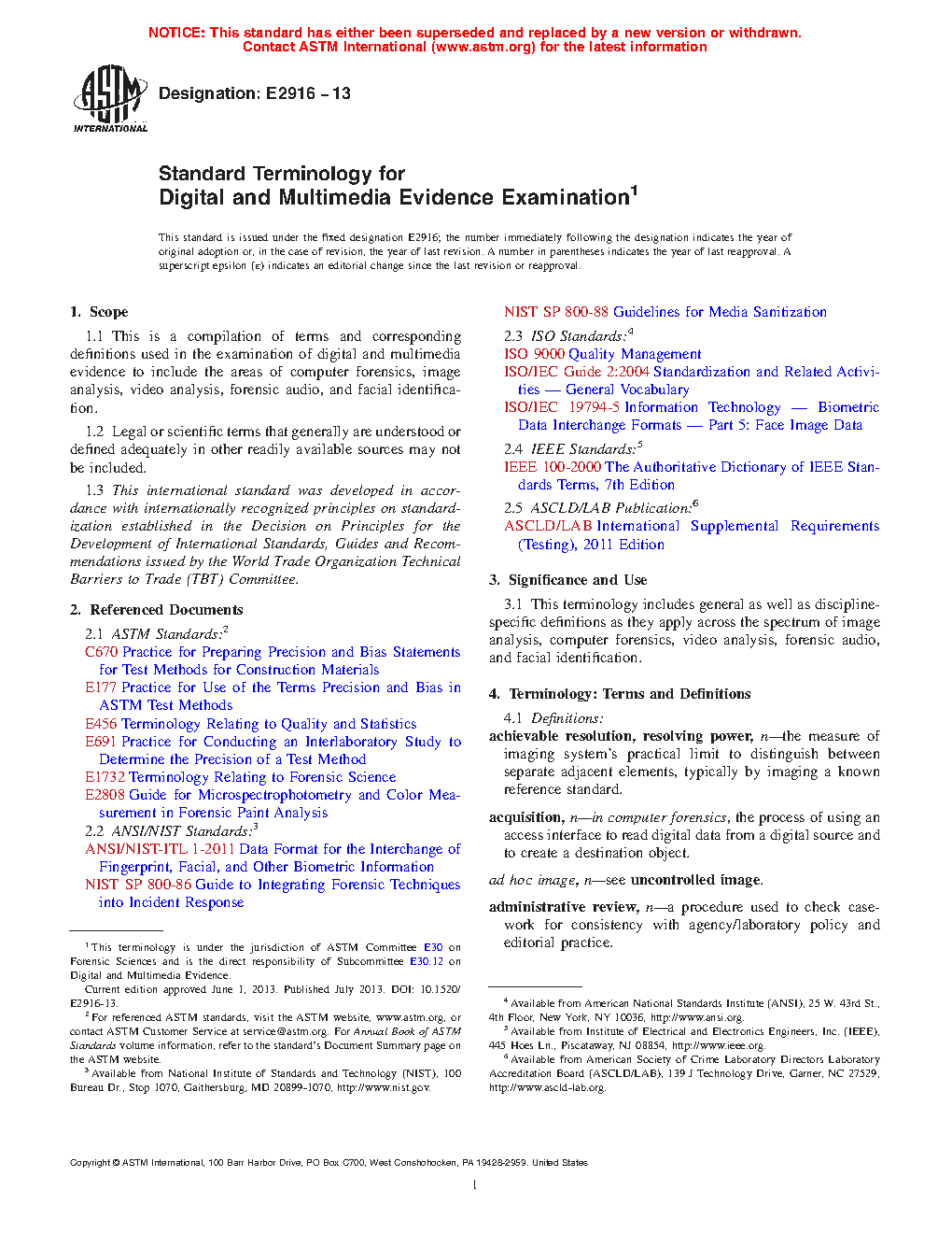 1.1 This is a compilation of terms and corresponding definitions used in the examination of digital and multimedia evidence to include the areas of computer forensics, image analysis, video analysis, forensic audio, and facial identification.
