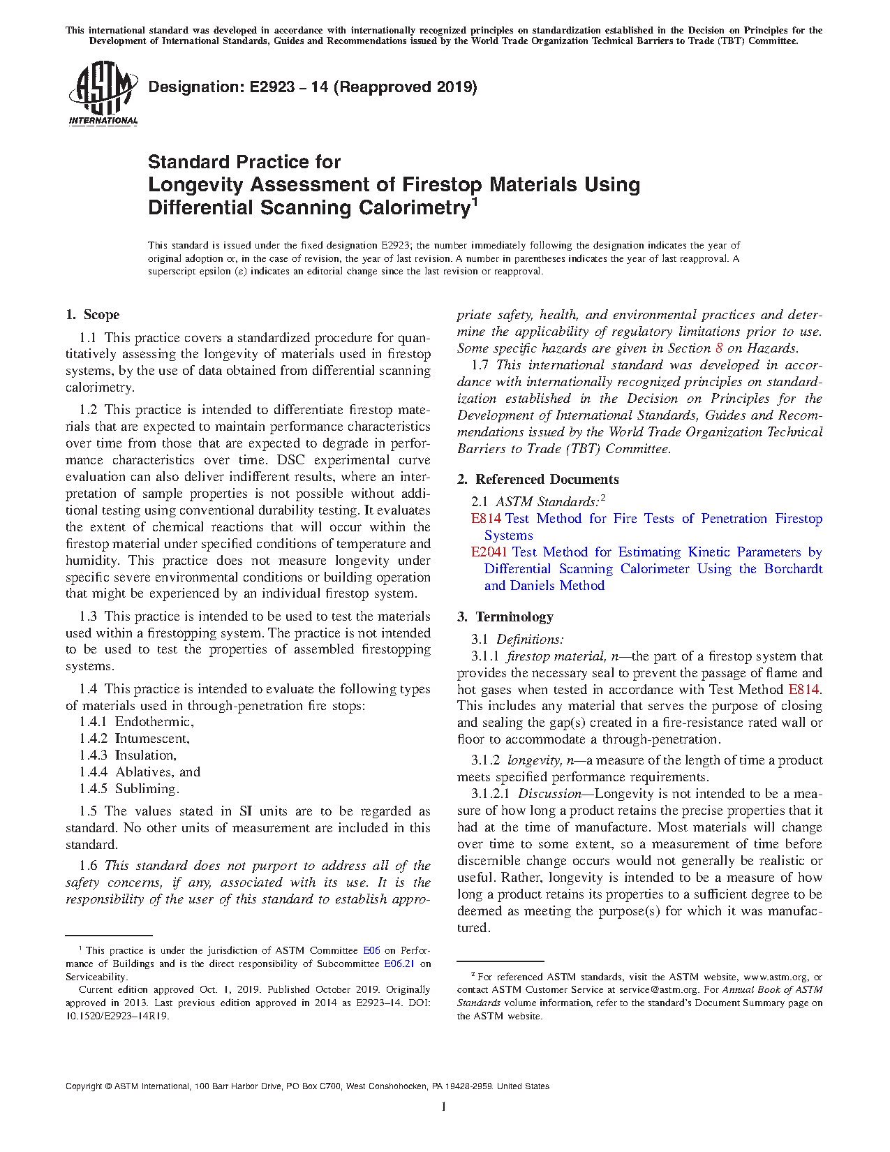 1.1 This practice covers a standardized procedure for quantitatively assessing the longevity of materials used in firestop systems, by the use of data obtained from differential scanning calorimetry.