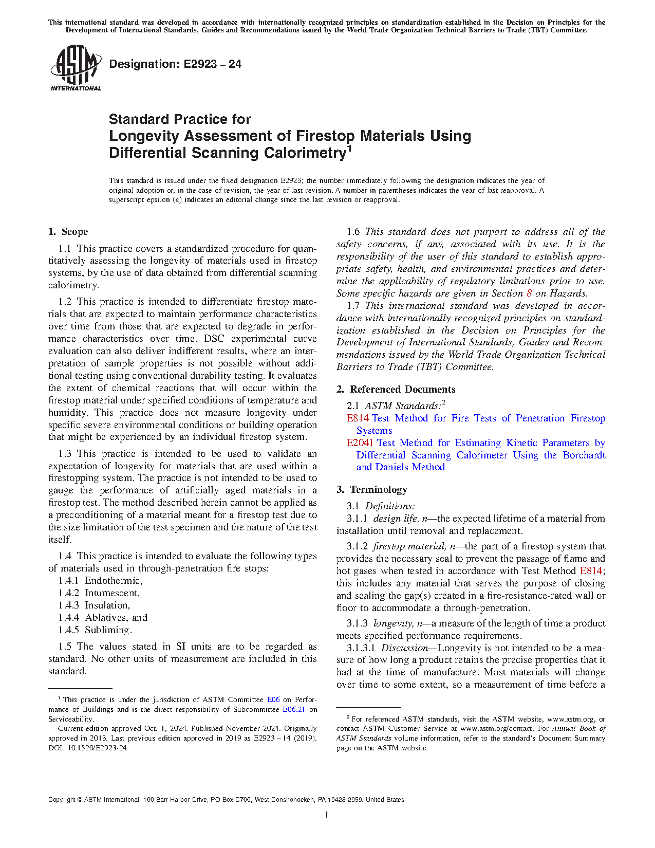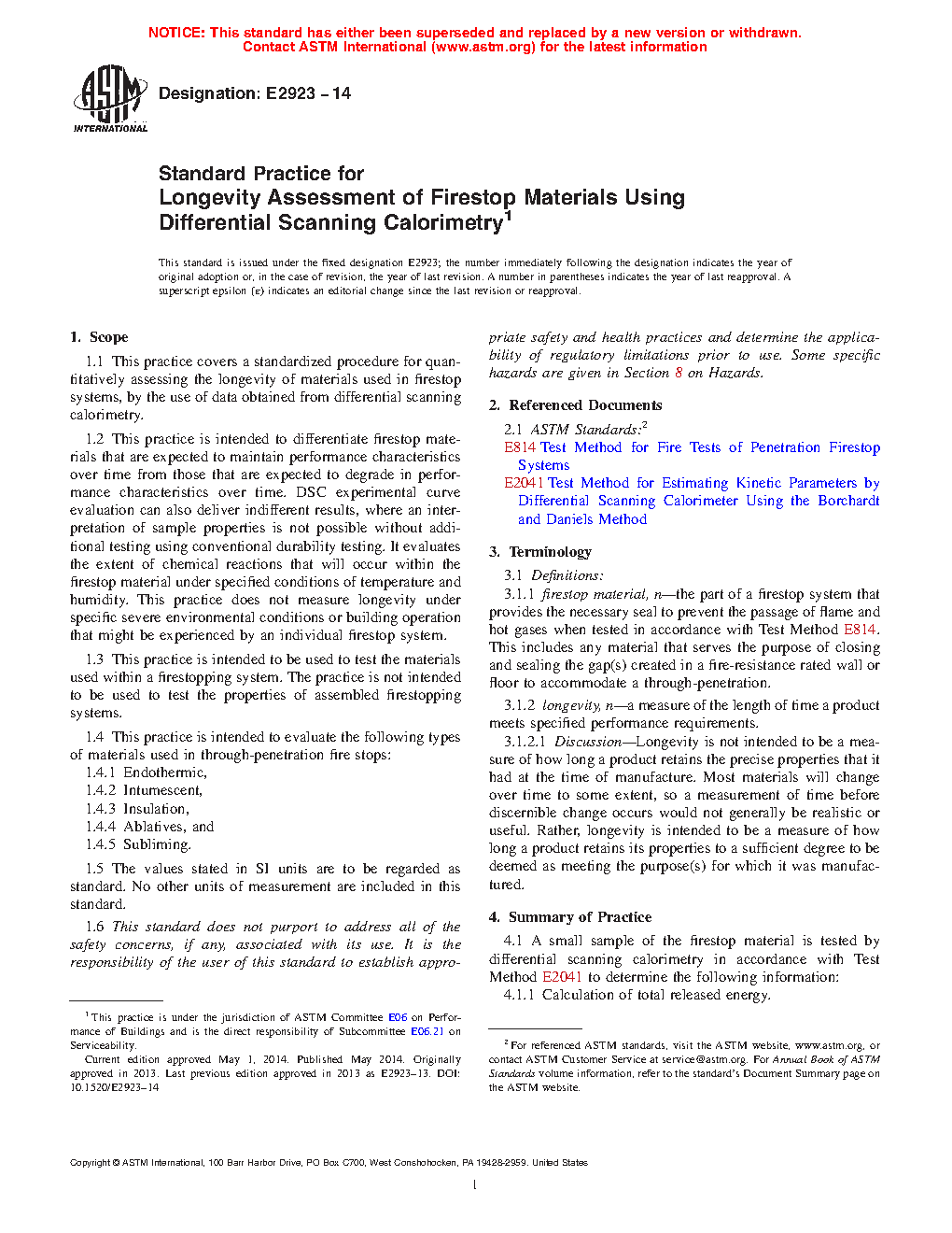 1.2 This practice is intended to differentiate firestop materials that are expected to maintain performance characteristics over time from those that are expected to degrade in performance characteristics over time. DSC experimental curve evaluation can also deliver indifferent results, where an interpretation of sample properties is not possible without additional testing using conventional durability testing. It evaluates the extent of chemical reactions that will occur within the firestop material under specified conditions of temperature and humidity. This practice does not measure longevity under specific severe environmental conditions or building operation that might be experienced by an individual firestop system.