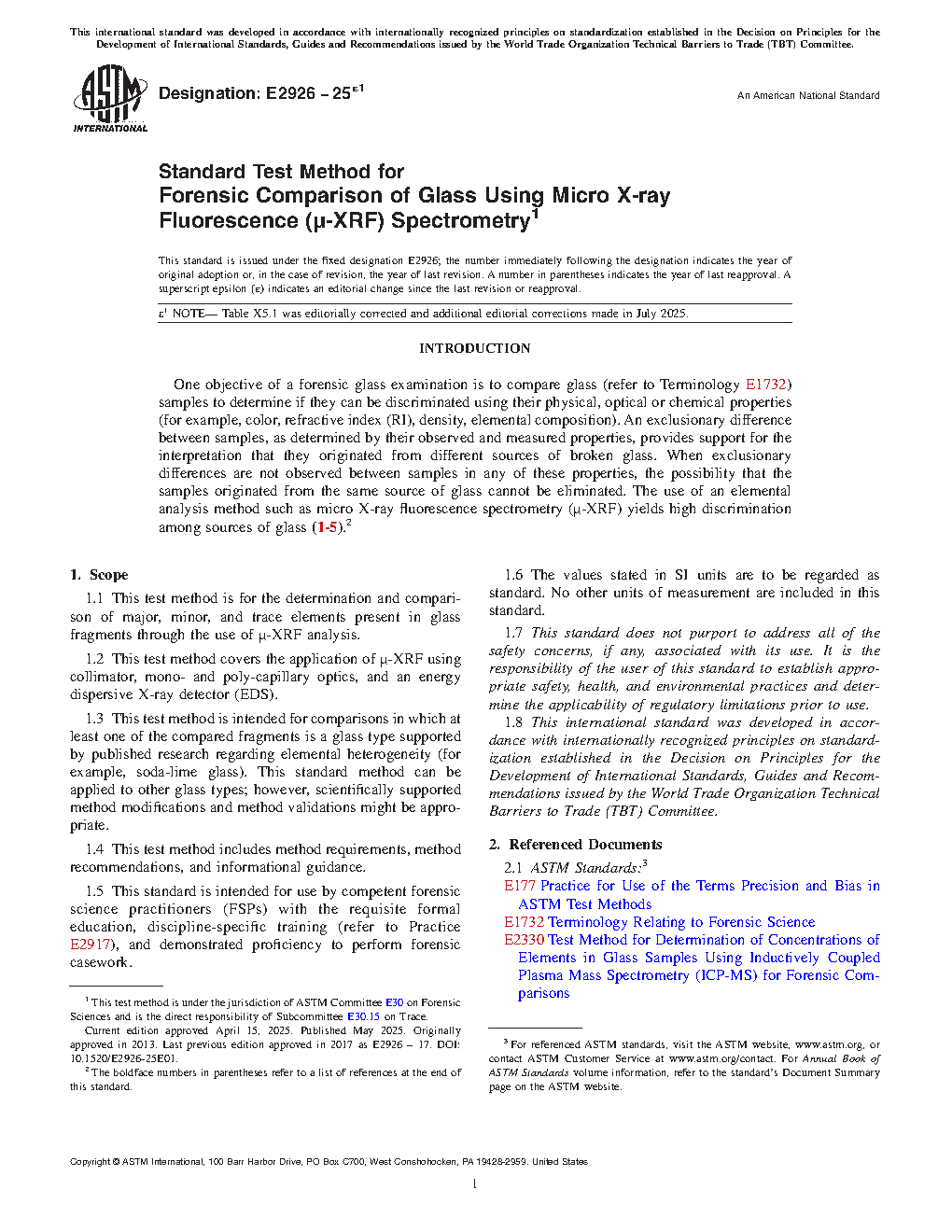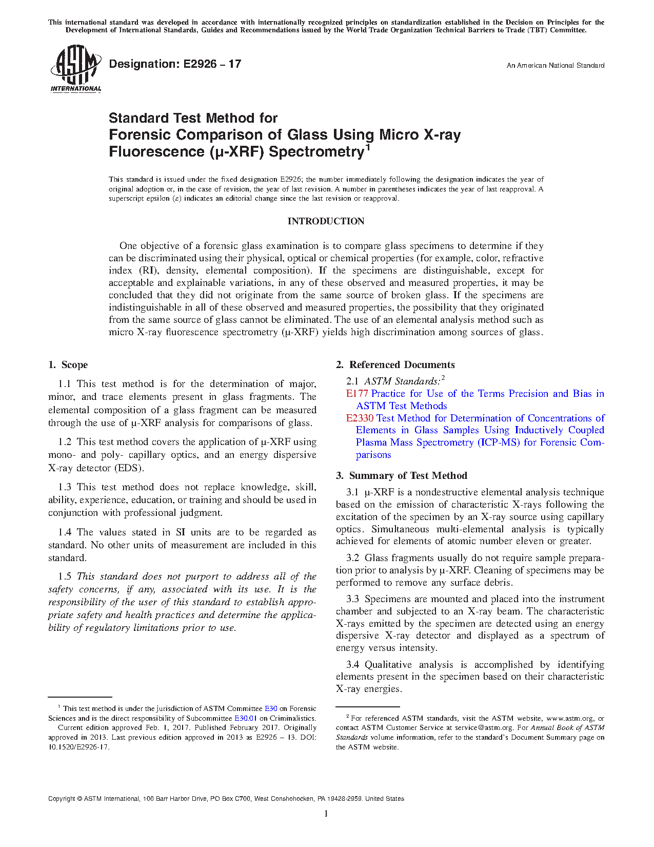 1.1 This test method is for the determination and comparison of major, minor, and trace elements present in glass fragments through the use of µ-XRF analysis.