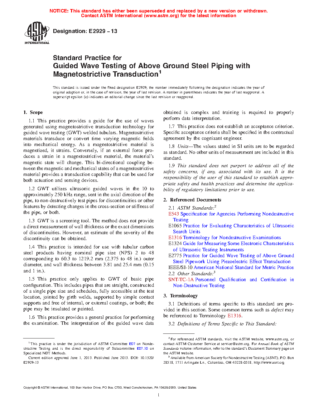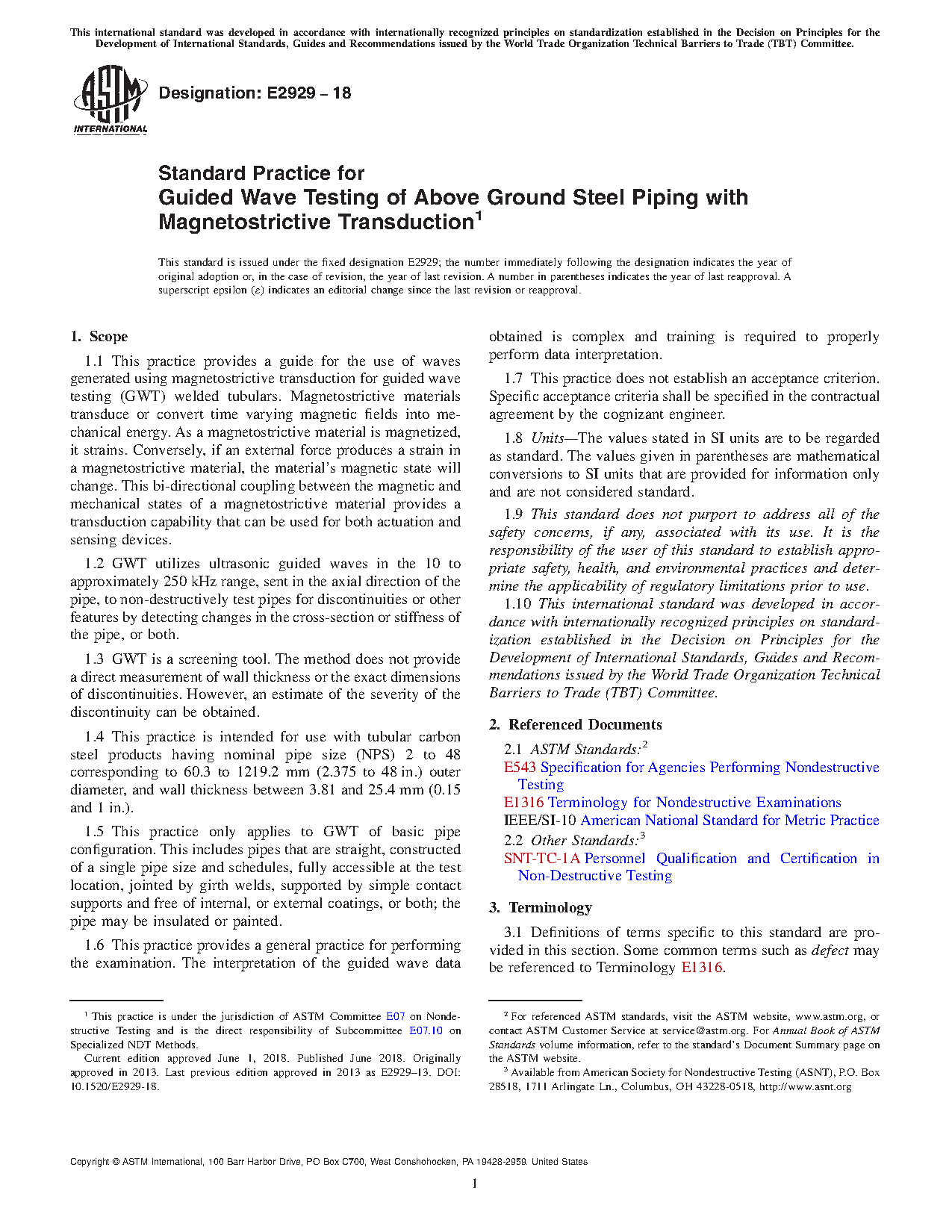 1.1 This practice provides a guide for the use of waves generated using magnetostrictive transduction for guided wave testing (GWT) welded tubulars. Magnetostrictive materials transduce or convert time varying magnetic fields into mechanical energy. As a magnetostrictive material is magnetized, it strains. Conversely, if an external force produces a strain in a magnetostrictive material, the material’s magnetic state will change. This bi-directional coupling between the magnetic and mechanical states of a magnetostrictive material provides a transduction capability that can be used for both actuation and sensing devices.
