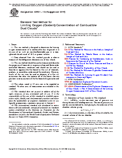 1.1 This test method is designed to determine the limiting oxygen concentration of a combustible dust dispersed in a mixture of air with an inert/nonflammable gas in a near-spherical closed vessel of 20 L or greater volume.