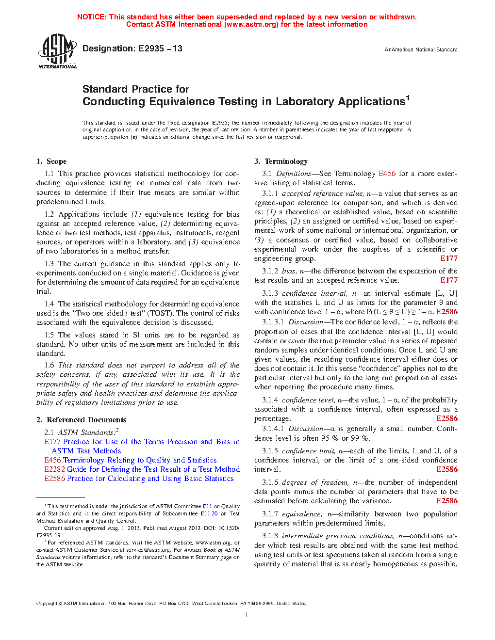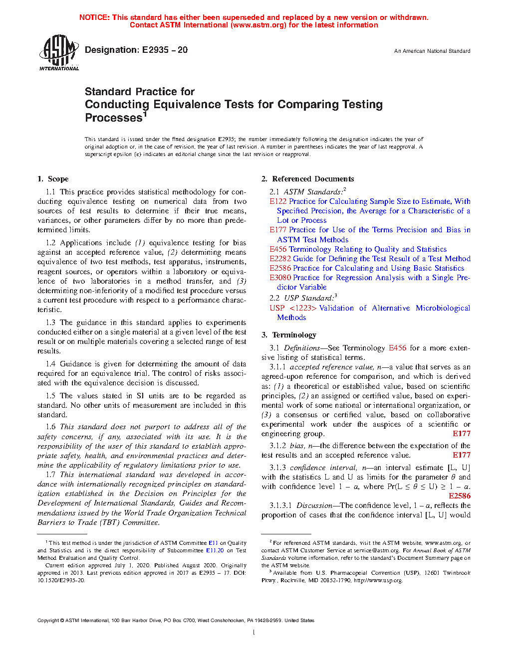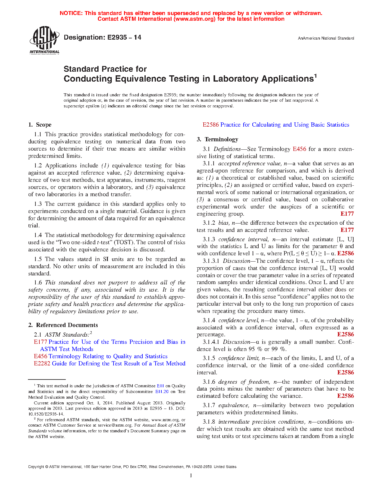 This practice provides statistical methodology for conducting equivalence testing on numerical data from two sources to determine if their true means or variances differ by no more than predetermined limits. This standard provides guidance on experiments and statistical methods needed to demonstrate that the test results from a modified testing process are equivalent to those from the current testing process, where equivalence is defined as agreement within a prescribed limit, termed an equivalence limit.