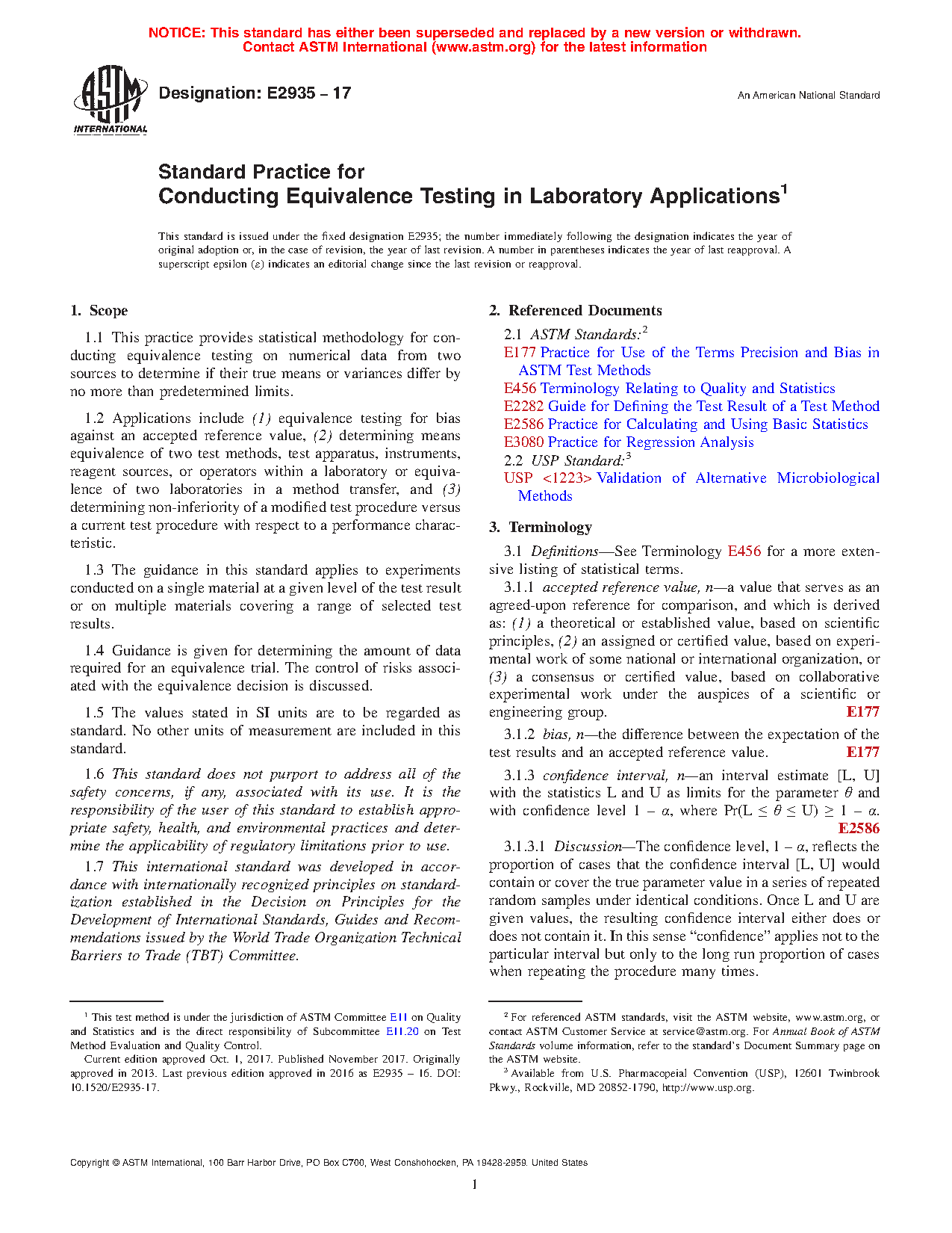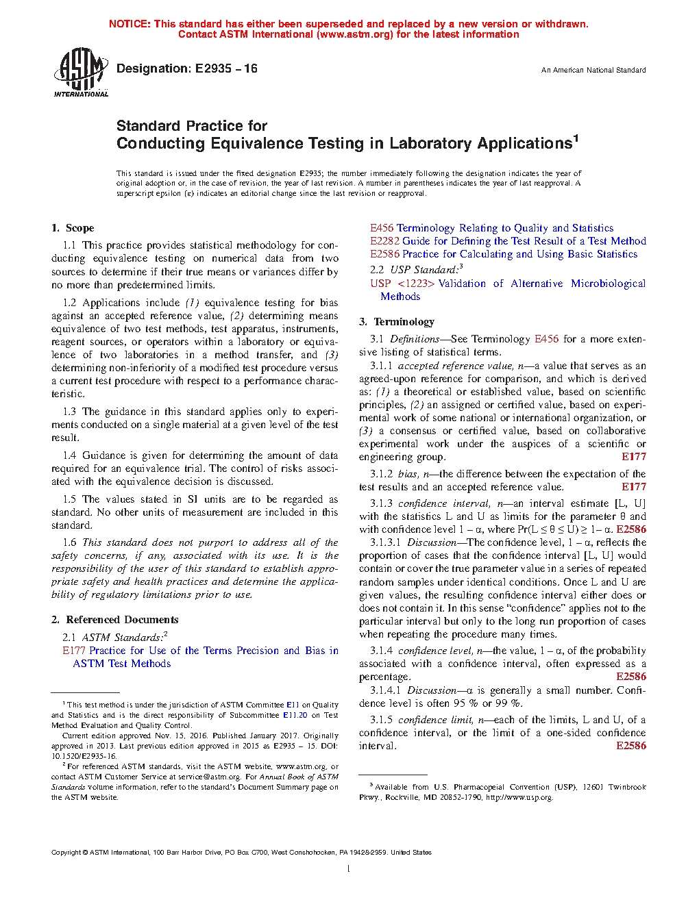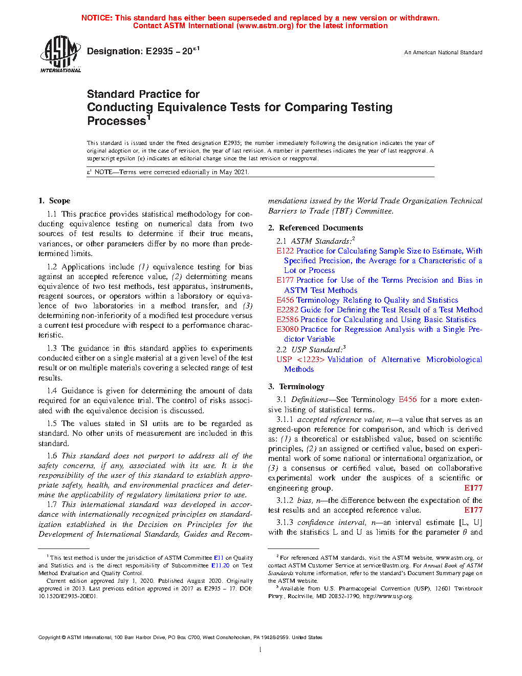 This practice provides statistical methodology for conducting equivalence testing on numerical data from two sources to determine if their true means or variances differ by no more than predetermined limits. This standard provides guidance on experiments and statistical methods needed to demonstrate that the test results from a modified testing process are equivalent to those from the current testing process, where equivalence is defined as agreement within a prescribed limit, termed an equivalence limit.