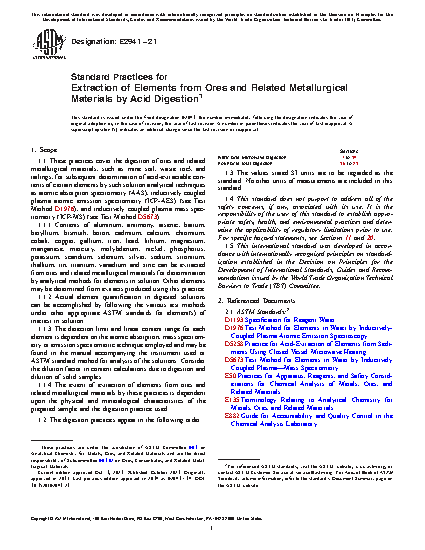 1.1 This practice covers the digestion of ores and related metallurgical materials, such as mine soil, waste rock and tailings, for subsequent determination of nitric acid-extractable contents of certain elements by such solution analytical techniques as atomic absorption, atomic emission (see Method D1976), and inductively coupled plasma mass spectroscopy (see Method D5673).