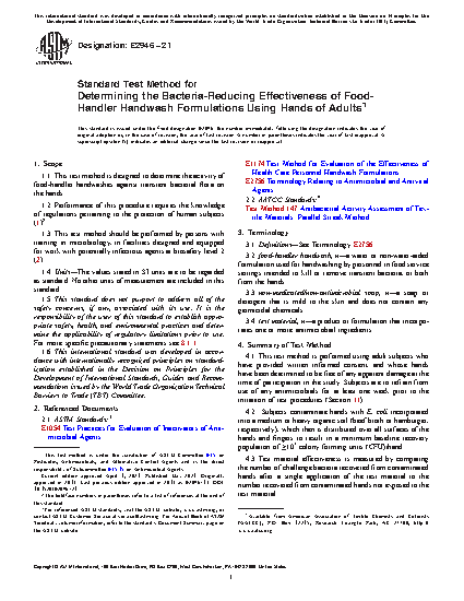 1.1 This test method is designed to determine the activity of food-handler handwashes against transient bacterial flora on the hands.