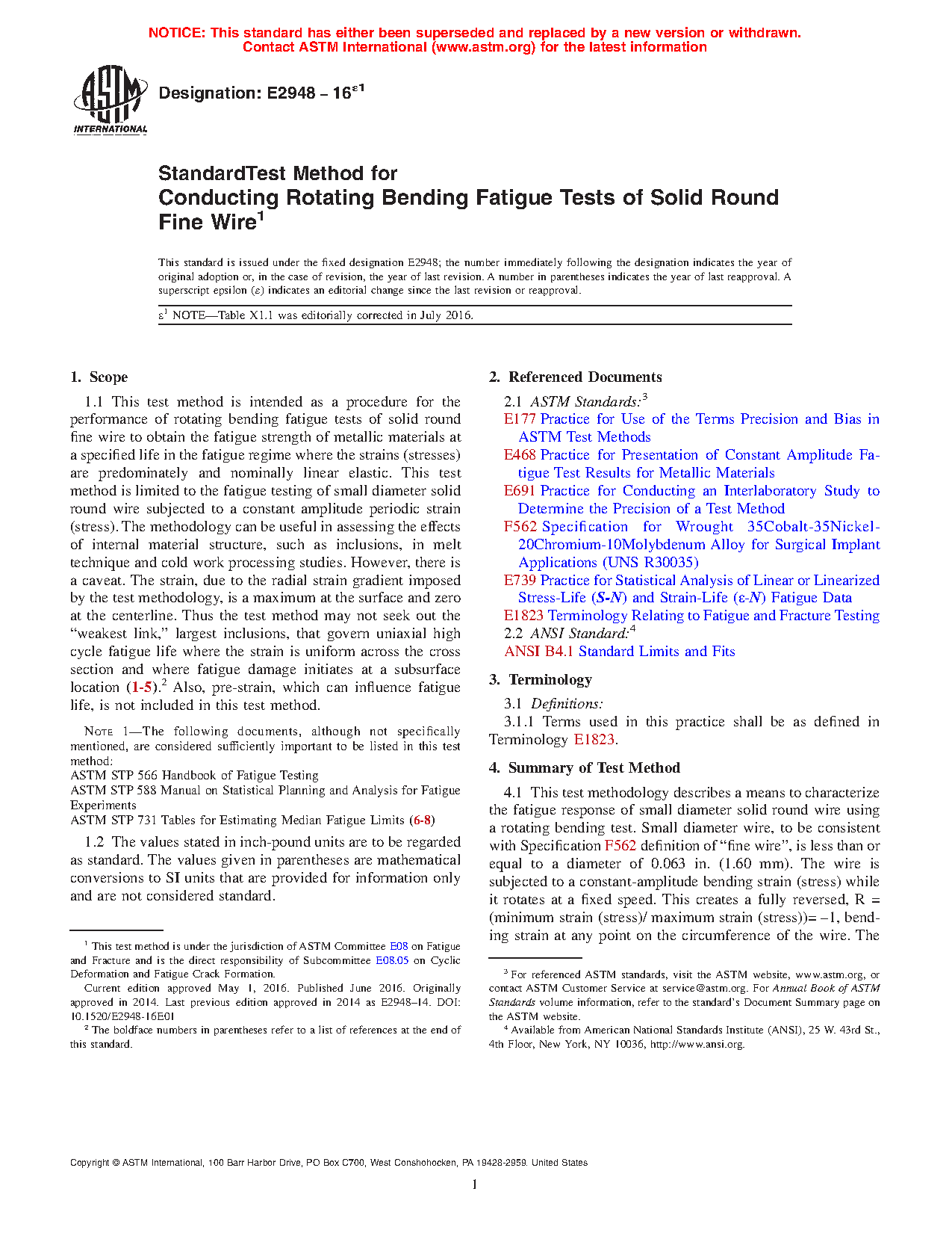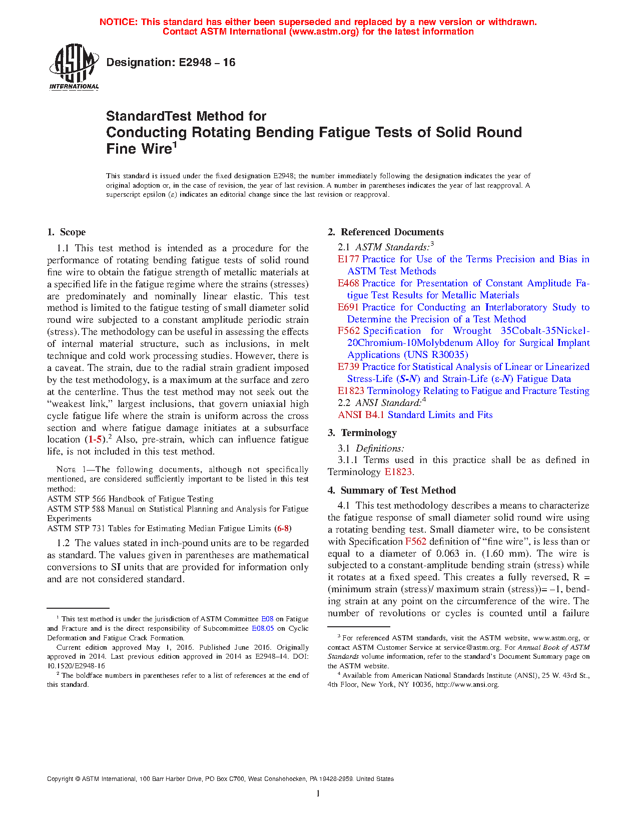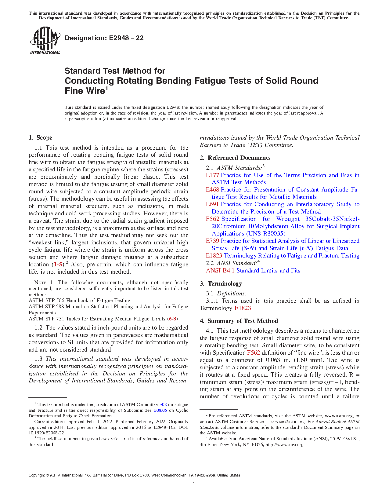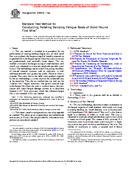 1.1 This test method is intended as a procedure for the performance of rotating bending fatigue tests of solid round fine wire to obtain the fatigue strength of metallic materials at a specified life in the fatigue regime where the strains (stresses) are predominately and nominally linear elastic. This test method is limited to the fatigue testing of small diameter solid round wire subjected to a constant amplitude periodic strain (stress). The methodology can be useful in assessing the effects of internal material structure, such as inclusions, in melt technique and cold work processing studies. However, there is a caveat. The strain, due to the radial strain gradient imposed by the test methodology, is a maximum at the surface and zero at the centerline. Thus the test method may not seek out the “weakest link,” largest inclusions, that govern uniaxial high cycle fatigue life where the strain is uniform across the cross section and where fatigue damage initiates at a subsurface location (1-5).2 Also, pre-strain, which can influence fatigue life, is not included in this test method.