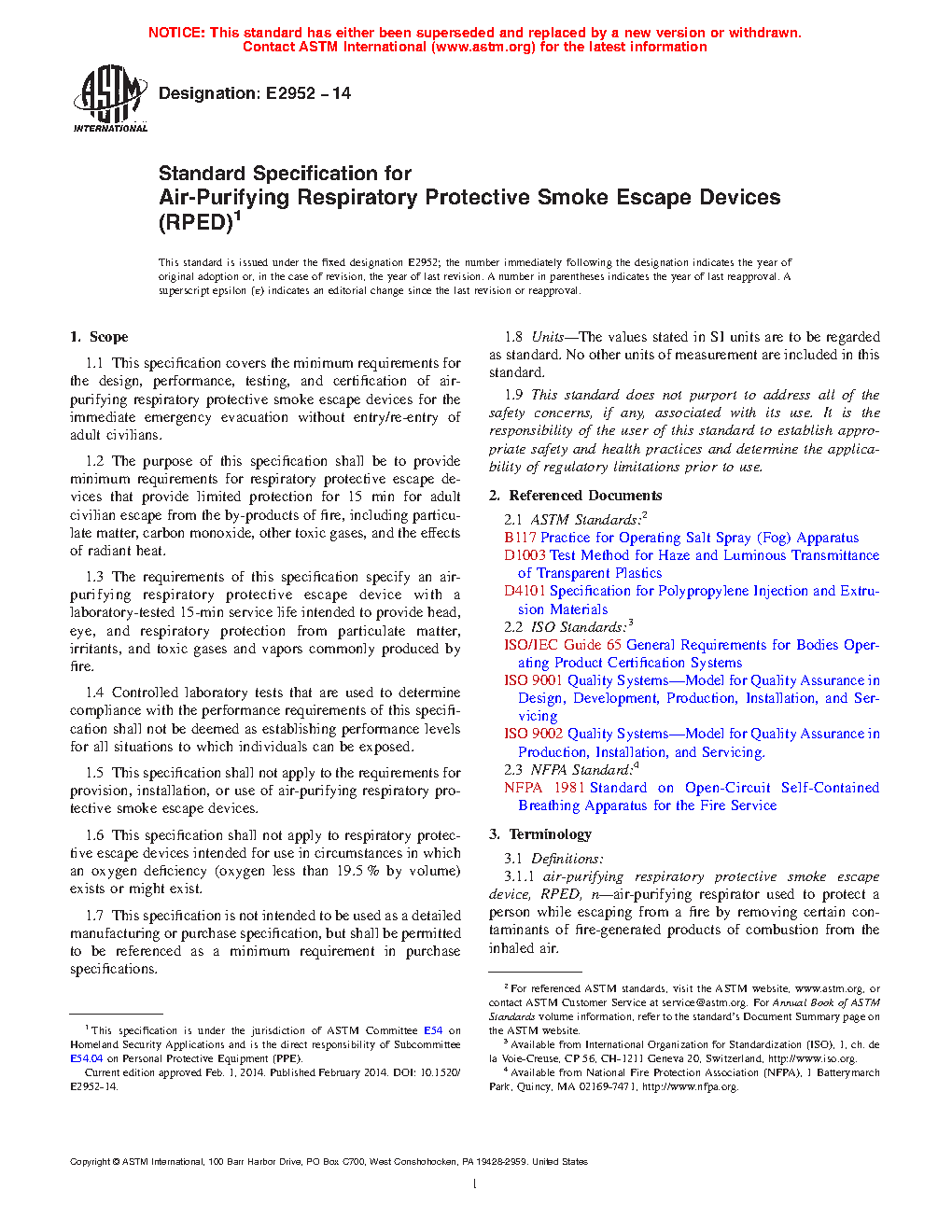 1.5 This specification shall not apply to the requirements for provision, installation, or use of air-purifying respiratory protective smoke escape devices.