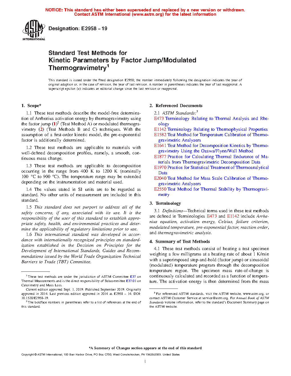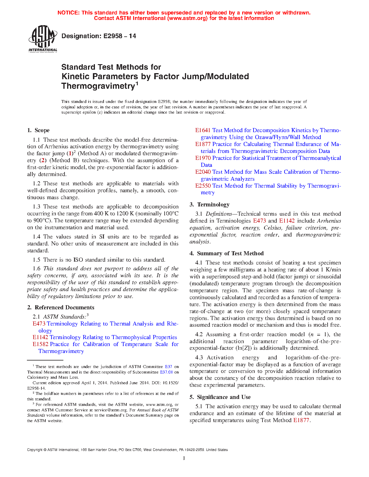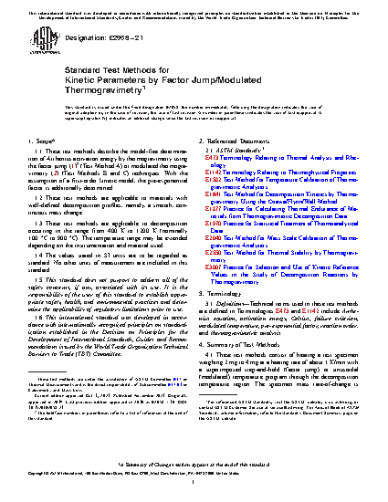 1.1 These test methods describe the model-free determination of Arrhenius activation energy by thermogravimetry using the factor jump (1)2 (Test Method A) or modulated thermogravimetry (2) (Test Methods B and C) techniques. With the assumption of a first-order kinetic model, the pre-exponential factor is additionally determined.