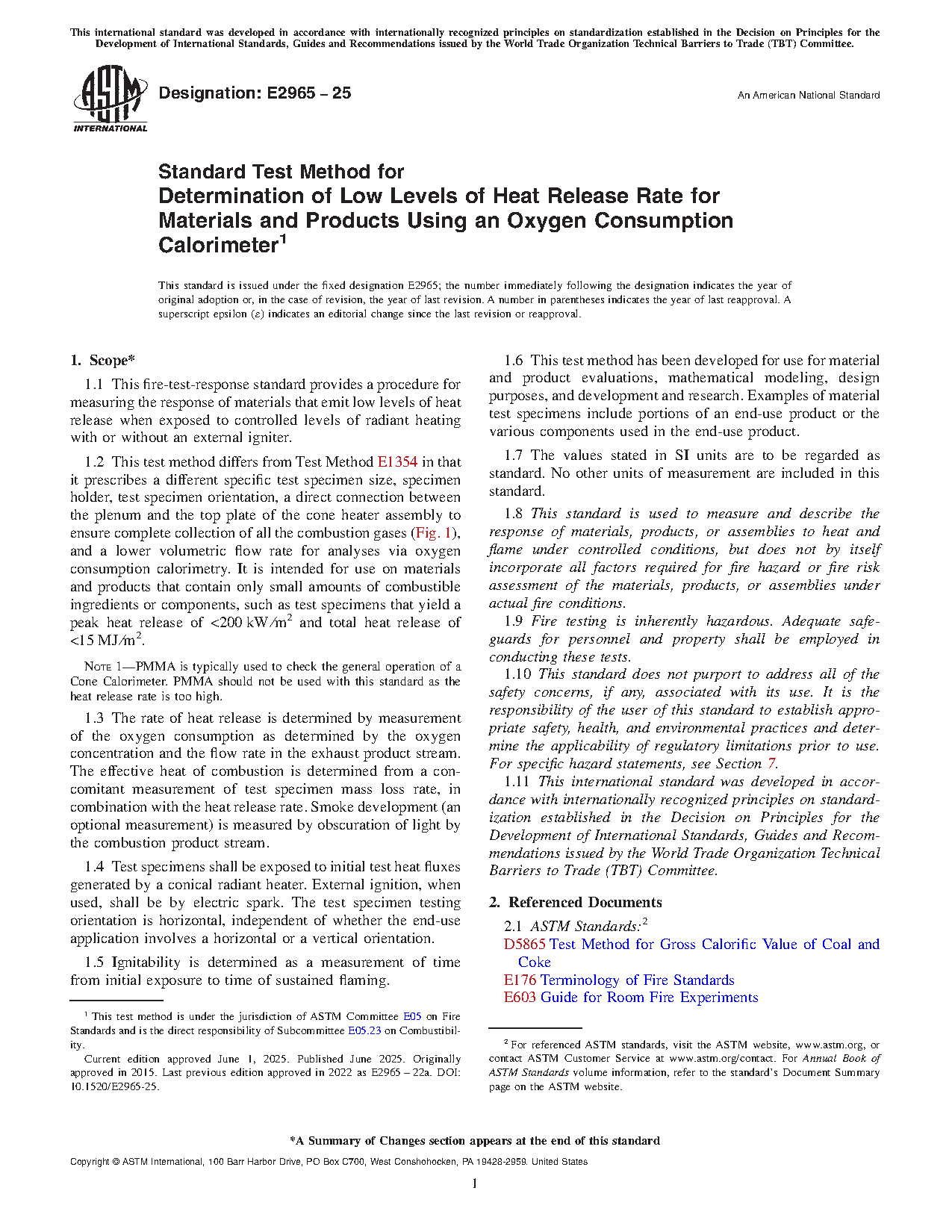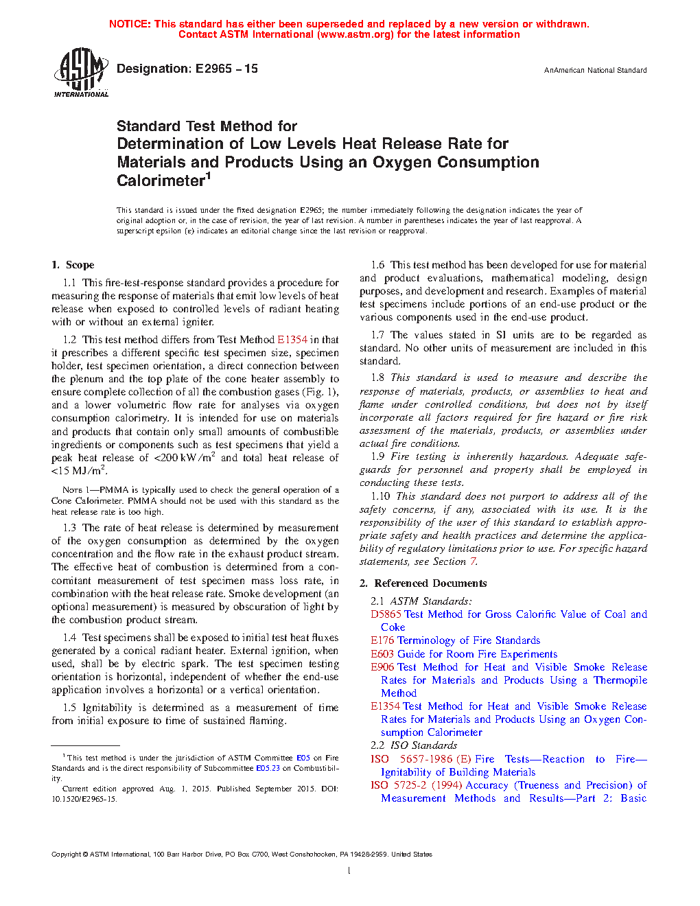 1.2 This test method differs from Test Method E1354 in that it prescribes a different specific test specimen size, specimen holder, test specimen orientation, a direct connection between the plenum and the top plate of the cone heater assembly to ensure complete collection of all the combustion gases (Fig. 1), and a lower volumetric flow rate for analyses via oxygen consumption calorimetry. It is intended for use on materials and products that contain only small amounts of combustible ingredients or components, such as test specimens that yield a peak heat release of <200 kW/m2 and total heat release of <15 MJ/m2.