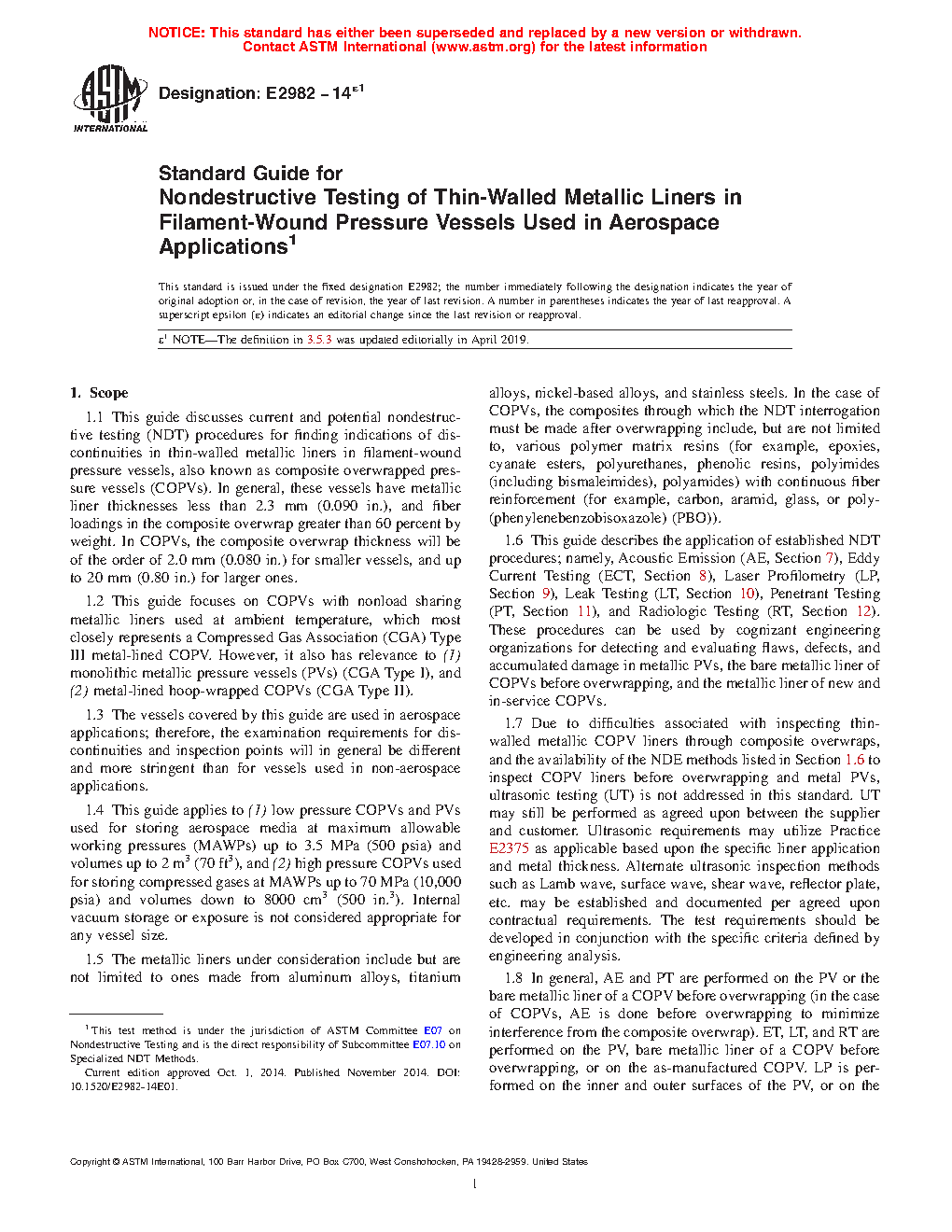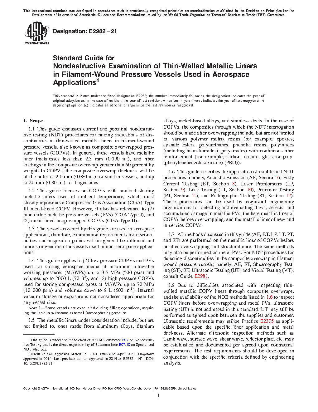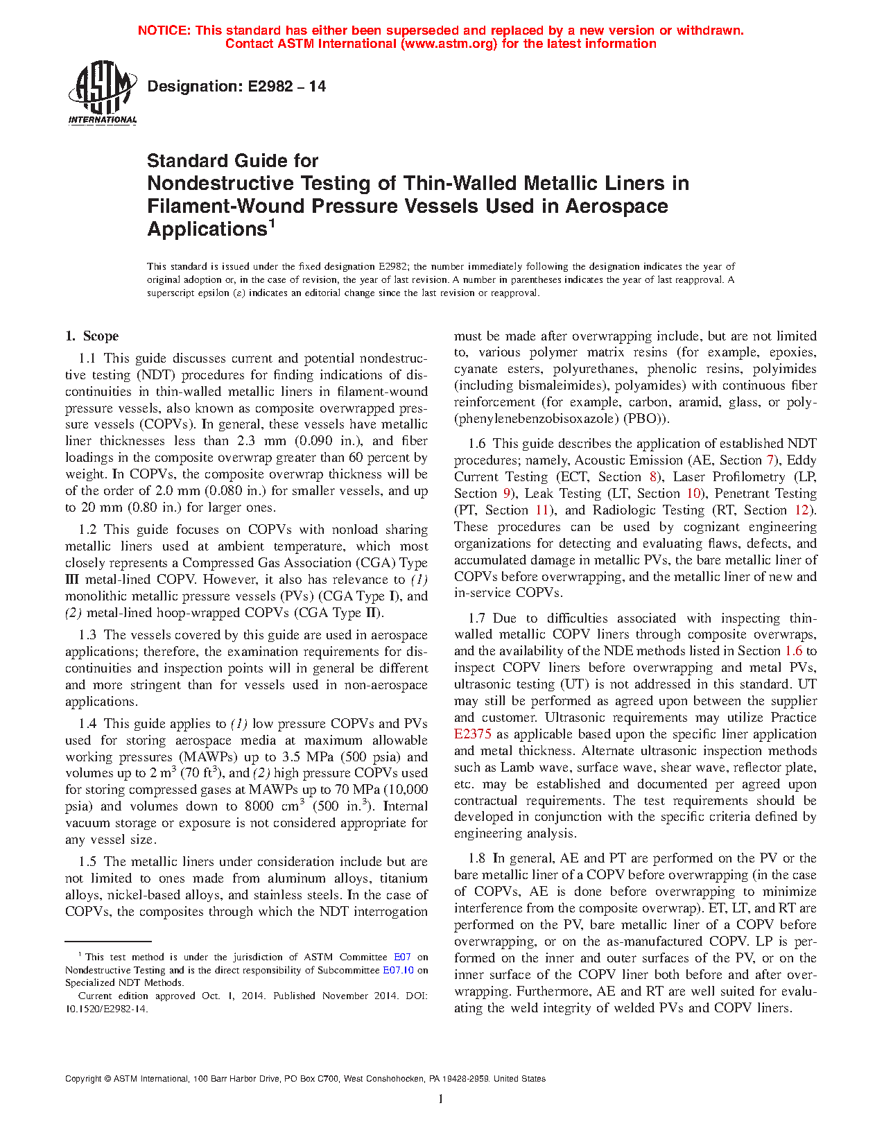 1.10 For NDT procedures that detect discontinuities in the composite overwrap of filament-wound pressure vessels (namely, AE, ET, shearography, thermography, UT and visual examination), consult E07’s forthcoming Guide for Nondestructive Testing of Composite Overwraps in Filament-Wound Pressure Vessels Used in Aerospace Applications.