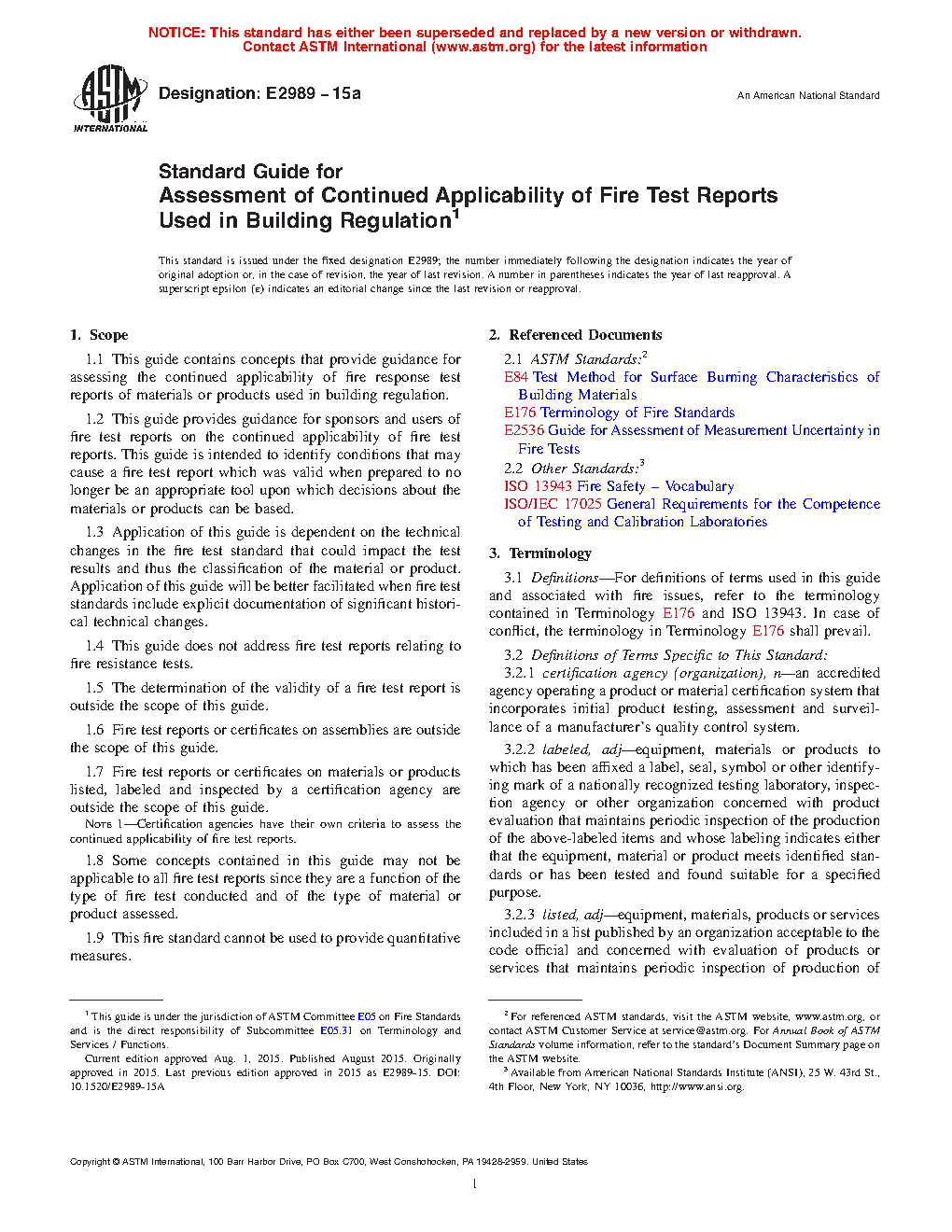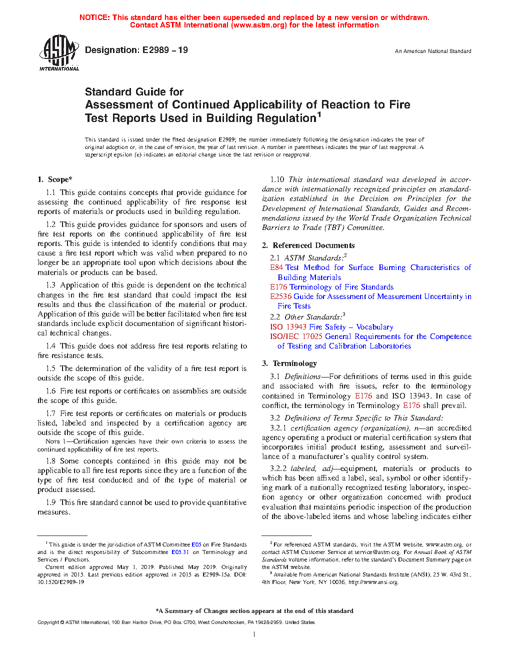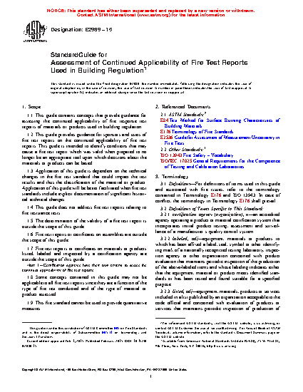 1.3 Application of this guide is dependent on the technical changes in the fire test standard that could impact the test results and thus the classification of the material or product. Application of this guide will be better facilitated when fire test standards include explicit documentation of significant historical technical changes.