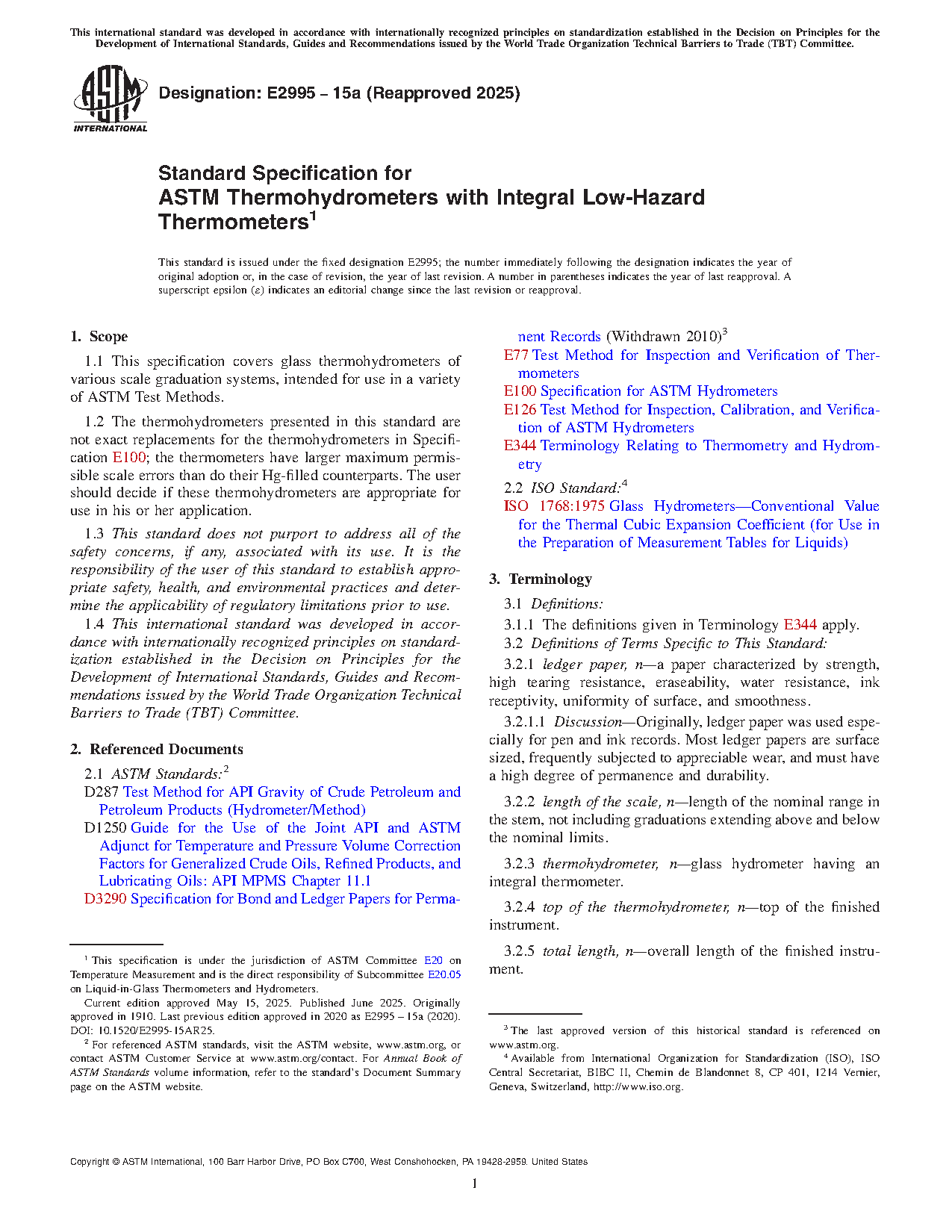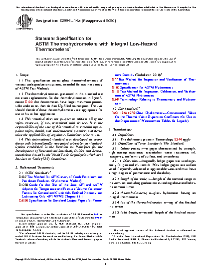 This specification is applicable to glass thermohydrometers of various scale graduation systems, intended for use in a variety of ASTM Test Methods. The thermohydrometers covered by this specification have larger maximum permissible scale errors than do their Hg-filled counterparts. It is up to the user to decide if these thermohydrometers are appropriate for use in his or her application. This specification establishes requirements for thermohydrometers with respect to type, body, ballast, stem, scale, markings, calibration and verification, packaging, and inspection procedures.