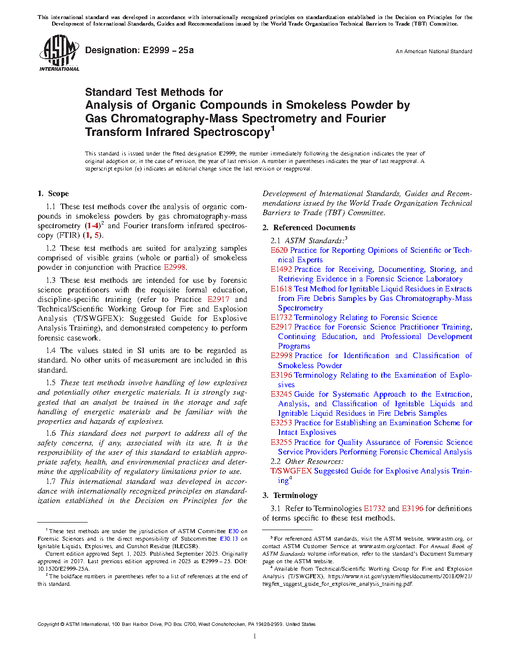 5.1 This test method establishes a procedure for the analysis and identification of organic components of smokeless powder by GC-MS and FTIR.
