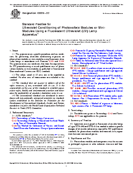 1.1 This practice covers specific procedures and test conditions for performing ultraviolet conditioning exposures on photovoltaic modules or mini-modules using fluorescent ultraviolet lamps in accordance with Practices G151 and G154. This practice covers test conditions that meet the requirements for UV preconditioning in initial qualification tests of photovoltaic modules or mini-modules as published in International Electrotechnical Commission (IEC) standards.