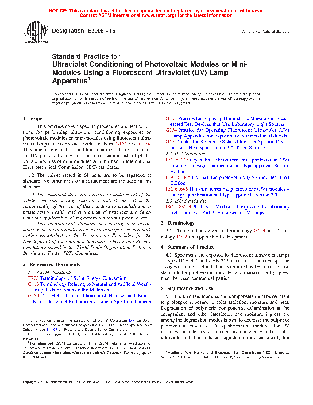 5.3 IEC exposure methods should not be considered as long-term weathering tests. Exposure to moisture in the form of condensation or water spray is not a requirement of the UV exposure tests in IEC PV module qualification standards. Inclusion of moisture is typically a consideration in weathering tests.