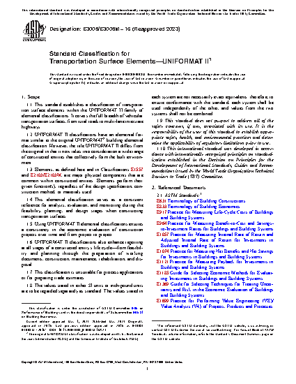 4.1 This standard builds on the concepts and organizational framework established in Classification E1557. This classification describes transportation surface elements that are major components of most vehicular transportation surfaces. The elemental classification is the common thread linking activities and participants in a transportation surface project from initial planning through operations, maintenance, and disposal.