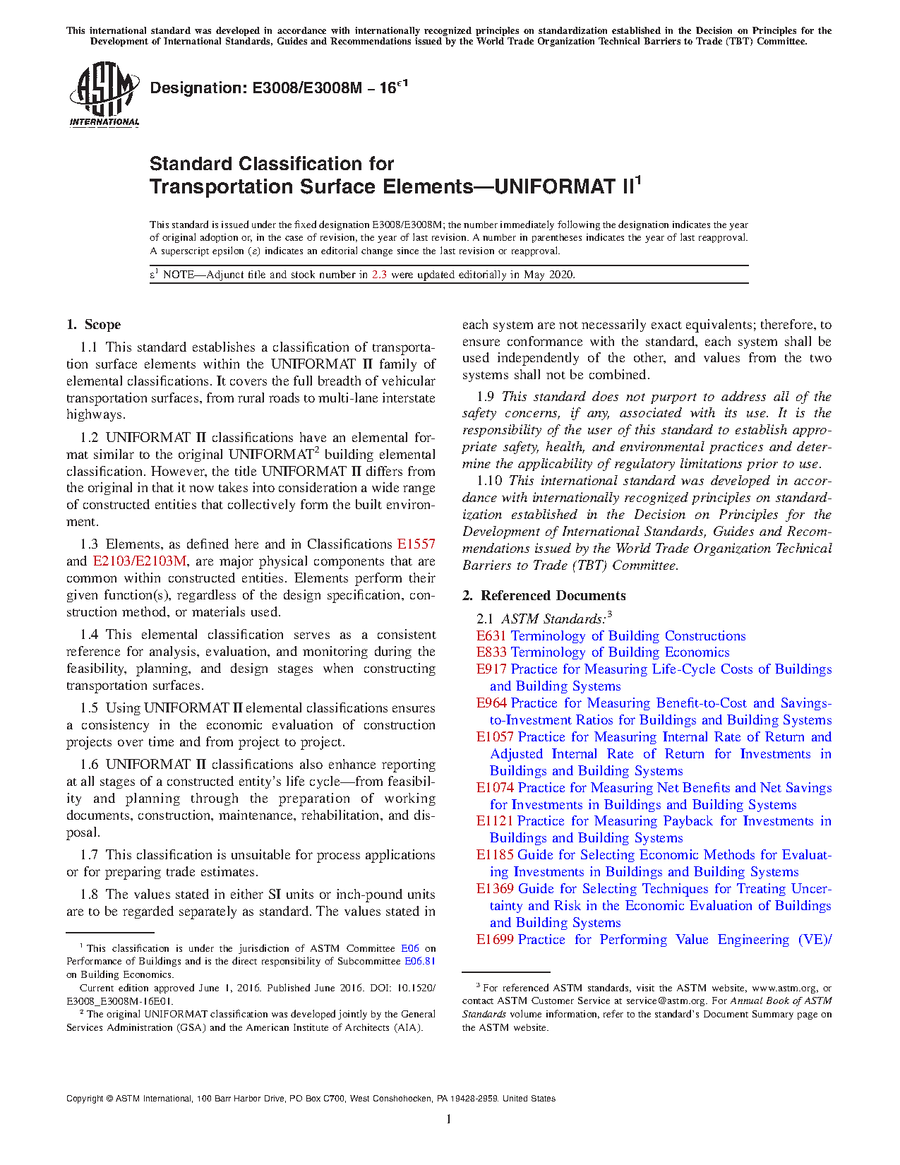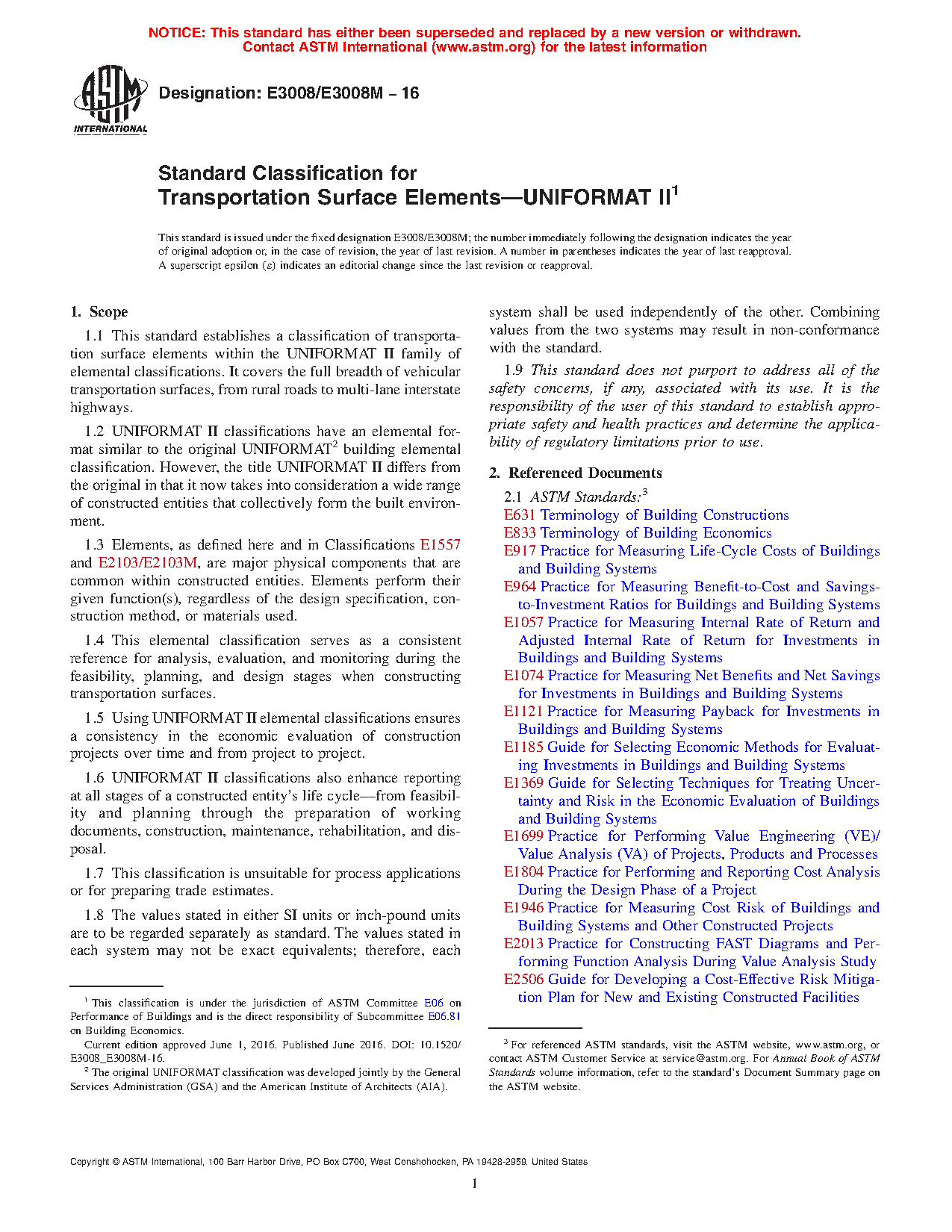 Note 1: As this classification refers solely to permanent, physical parts of any construction, two additional classifications, Classifications E2083 and E2168, need to be included when calculating construction cost. These standards provide for the inclusion of construction enabling, temporary, and risk mitigation cost figures. Procedures for reporting all these figures are described in Practices E1804 and E2514 and Classification E2516. While these three latter standards were primarily written for building construction, they are nonetheless appropriate and readily applied to other forms of construction as well.