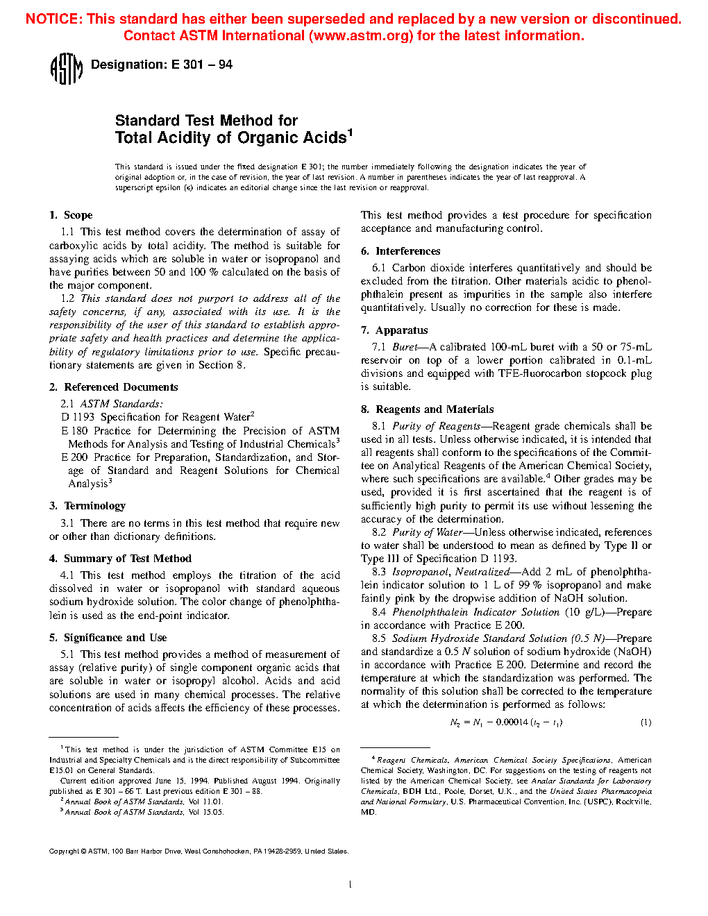 Standard Test Method for Total Acidity of Organic Acids (Withdrawn 2001)