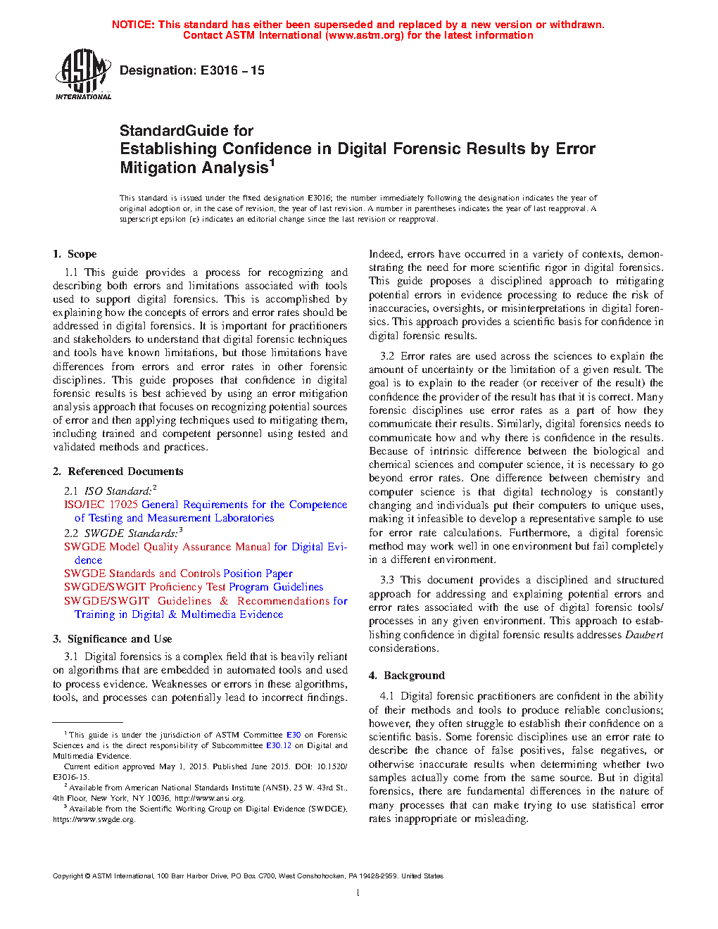 1.1 This guide provides a process for recognizing and describing both errors and limitations associated with tools used to support digital forensics. This is accomplished by explaining how the concepts of errors and error rates should be addressed in digital forensics. It is important for practitioners and stakeholders to understand that digital forensic techniques and tools have known limitations, but those limitations have differences from errors and error rates in other forensic disciplines. This guide proposes that confidence in digital forensic results is best achieved by using an error mitigation analysis approach that focuses on recognizing potential sources of error and then applying techniques used to mitigating them, including trained and competent personnel using tested and validated methods and practices.